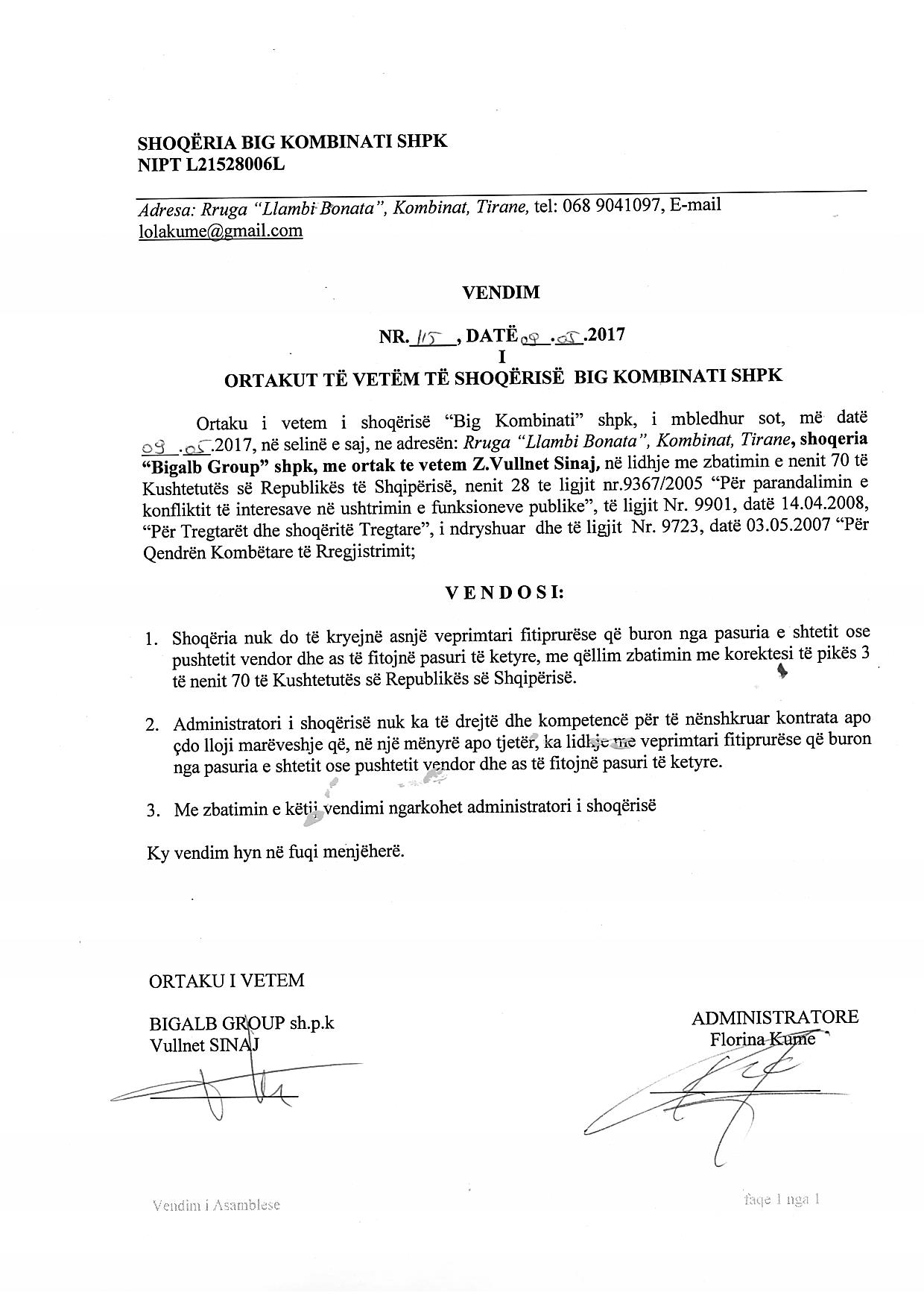 | Çështje Ligjore: | Me datë 09.05.2017, me Vendim Nr. 1/5 të Asamblesë së Zakonshme, u vendos që Shoqeria nuk do te kryeje asnje veprimtari fitimprurese qe buron nga pasuria e shtetit ose pushteti vendor dhe as te fitoje pasuri te ketyre , me qellim zbatimin me korrektesi te pikes 3 te nenit 70 te Kushtetutes se Republikes se Shqiperise. Administratori i shoqerise nuk ka te drejte dhe kompetence per te nenshkruar kontrata apo cdo lloji mareveshje qe, ne nje menyre apo tjeter, ka lidhje me veprimtari fitimprurese qe buron nga pasuria e shtetit ose pushtetit vendor dhe as te fitoje pasuri te ketyre. |