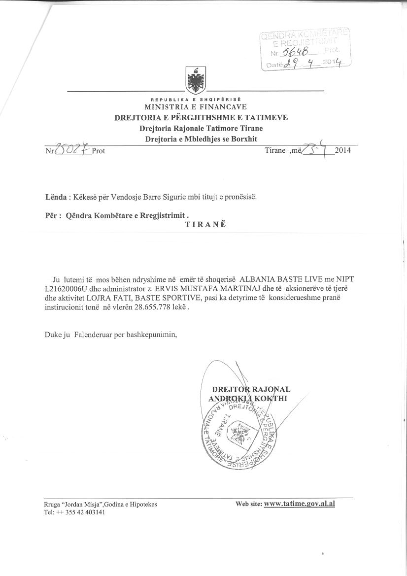 pronësisë Nr. 25027 Prot., lëshuar nga Drejtoria Rajonale Tatimore Tiranë u kerkua te mos bëhen ndryshime në emër të subjektit "ALBANIA BASTE LIVE " sh.p.k, pajisur me NUIS (NIPT)- L21620006U me administrator Z. Ervis Martinaj. II. Me date 30/07/2014, me ane te Shkresës Nr. 51196/1 Prot, datë 23.7.2014, lëshuar nga Drejtoria Rajonale Tatimore Tiranë, u kerkua vendosja e Barrës së Sigurisë mbi titujt e pronësisë, me qëllim, mos lejimin e tjetërsimit të titujve të pronësisë përfshirë edhe shitblerjen e aksioneve, deri në shlyerjen e detyrimeve tatimore, nga ana e tatimpaguesit debitor. III. Me date 30/05/2016, me ane te Urdhrit Nr.31314 Prot, Nr. 364 Dosje, date 19.05.2016, protokolluar nga QKB me Nr.1819 datë 26.05.2016, lëshuar nga Studio Përmbarimore “ARB”, drejtuar QKB, u urdherua vendosja e menjëhershme e masës së sekuestros konservative në aksionet e shoqërisë “ALBANIA BASTE LIVE “, me NIPT L21620006U, me përfaqësues ligjor, z.Ervis Martinaj dhe moskryerjen e asnjë veprimi tjetër i cili mund të ndryshojë të dhënat e regjistrit tregtar. IV. Me date 04/06/2021, me ane te Kërkesës Nr. 5135 Prot, datë 02.06.2021 “Kërkesë për vendosjen e masës së sigurimit tatimor”, ardhur nga Drejtoria e mbledhjes së detyrimeve tatimore të papaguara Rajoni Qendror u kerkua vendosja e masës së sigurimit tatimor mbi pasuritë e tatimpaguesit “ALBANIA BASTE LIVE”sha pajisur me NUIS (NIPT) L21620006U, duke moslejuar tjetërsimin mbi pasurinë dhe të drejtat pasurore që i përkasin këtij subjekti. |