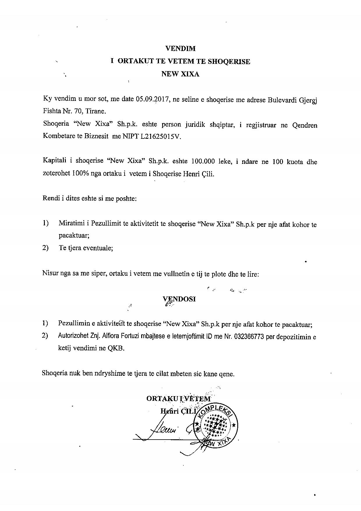 | Çështje Ligjore: | I. Më datë 17.09.2012, u lidh marrëveshja siguruese ndërmjet shoqërisë “New Xixa” shpk (barrëdhënës), shoqërisë “Para Albania Orel Rusi” shpk (barrëdhënës) dhe Banka Credins (barrëmarrës), me objekt: krijimi i një barre siguruese mbi pasuritë e luajtshme të barrëdhënësit si garanci për kredinë e akorduar nga Banka Credins në bazë të kontratës së kredisë afatgjatë Nr. 4638, datë 24.05.2012. II. Më datë 13.11.2014, me anë të shkresës Nr. 83112/1 Prot, lëshuar nga Drejtoria Rajonale Tatimore Tiranë, u kërkua vendosja e Barrës së Sigurisë mbi titujt e pronësisë, me qëllim, mos lejimin e tjetërsimit të titujve të pronësisë përfshirë edhe shitblerjen e aksioneve, deri në shlyerjen e detyrimeve tatimore, nga ana e tatimpaguesit debitor. III. Më datë 03.03.2015, me anë të shkresës Nr.16892/2 Prot, lëshuar nga Drejtoria Rajonale Tatimore Tiranë, u kërkua të lirohet nga barra siguruese mbi titujt e pronësisë subjekti NEË XIXA sh.p.k pajisur me NUIS-(NIPT)- L21625015V. IV. Më datë 05.09.2017, me vendim të ortakut të vetëm, u miratua pezullimi i aktivitetit të shoqërisë për një afat kohor të pacaktuar. |
