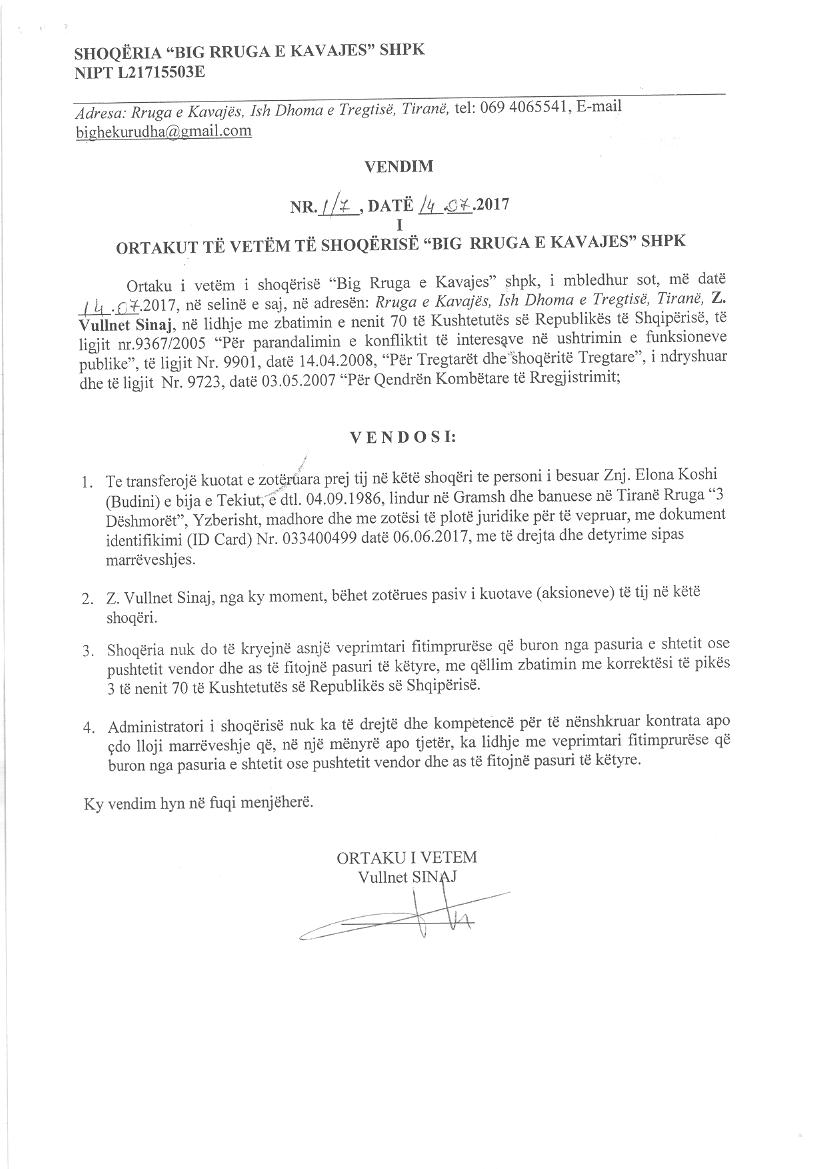 | Shënime: | Kompetencat e Administratorit: Administratori i shoqerise nuk ka ate drejte dhe kompetence per te nenshkruar kontrata apo cdo lloj mareveshje qe ne nje menyre apo tjeter ka lidhje me veprimtari fitimprurese qe buron nga pasuria e shtetit ose pushtetit vendor dhe as te fitojne pasuri te ketyre. |