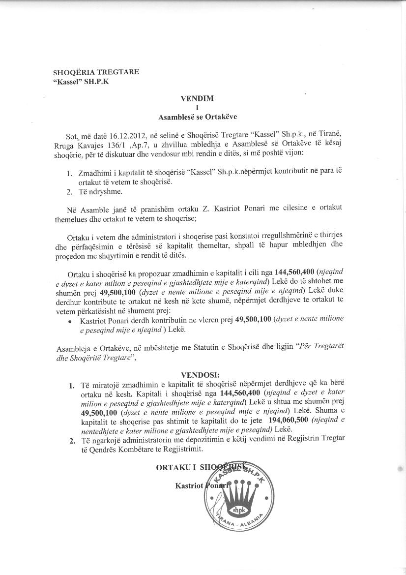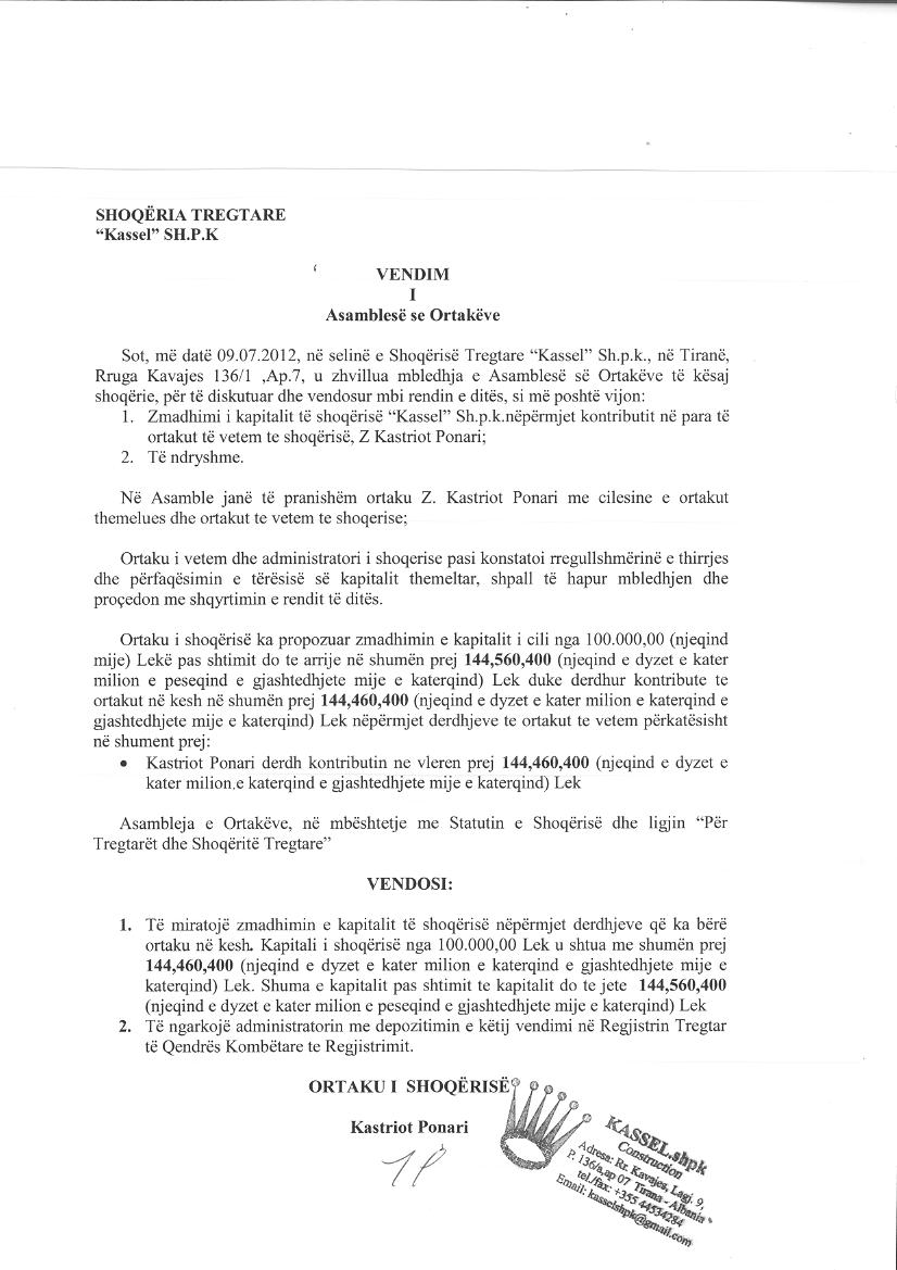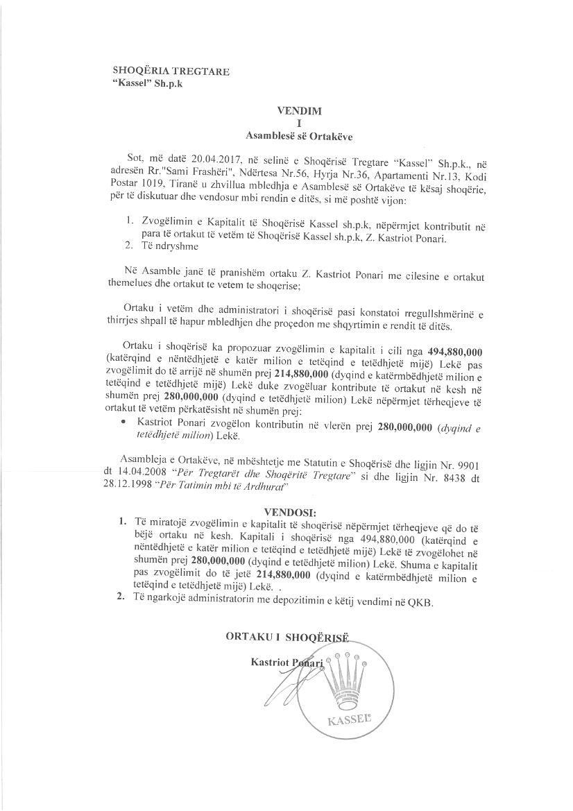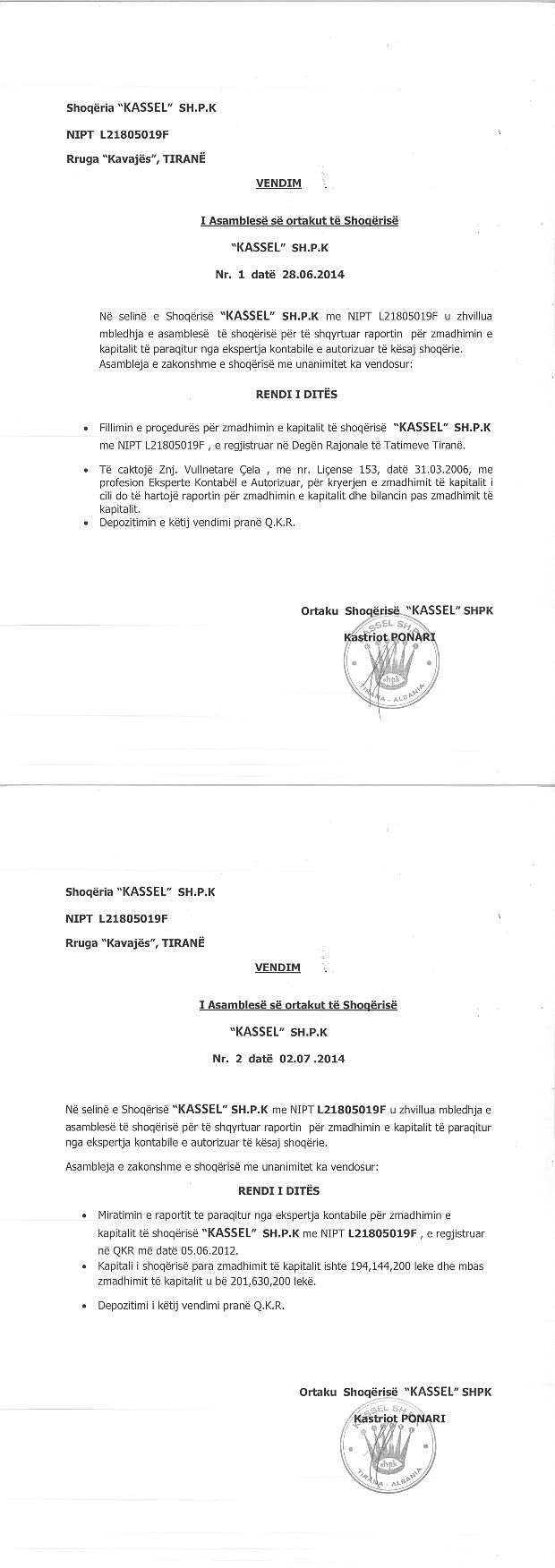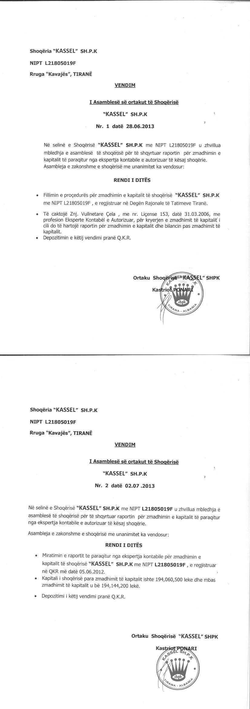 → Ekstrakti Historik i Regjistrit Tregtar date 15.11.2021 → Akti I themelimit → Vendimi I asamblese se ortakeve per zmadhimin e kapitalit 09.07.2012 → Vendimi I asamblese se ortakeve per zmadhimin e kapitalit 16.12.2012 → Vendimi I asamblese se ortakeve per zmadhimin e kapitalit 02.07.2013 → Vendimi I asamblese se ortakeve per zmadhimin e kapitalit 02.07.2014 → Vendimi I ortakut per marrjen e overdraftit 22.04.2016 → Vendimi I asamblese se ortakeve per zmadhimin e kapitalit 01.09.2016 → Marreveshje pengu 30.12.2016 → Vendimi I asamblese se ortakeve per zvogelimin e kapitalit 20.04.2017 → Vendimi I asamblese se ortakeve per zmadhimin e kapitalit 26.05.2017 → Marreveshje siguruese 30.06.2017 → Marreveshje siguruese 16.03.2018 → Urdher vendosje sekuestro 06.11.2018 → Urdher per heqjen e sekuestros 12.11.2018 → Urdher per venien e sekuestros 05.12.2018 → VKM nr. 54, datë 05.02.2014, Për përcaktimin e kritereve, të procedurës e të mënyrës së dhënies me qira, enfiteozë apo kontratave të tjera të pasurisë shtetërore → Ekstrakt Historik i Regjistrit Tregtar date 08.12.2023 → Urdhër për Vënien e Sekuestros datë 14.06.2023 |