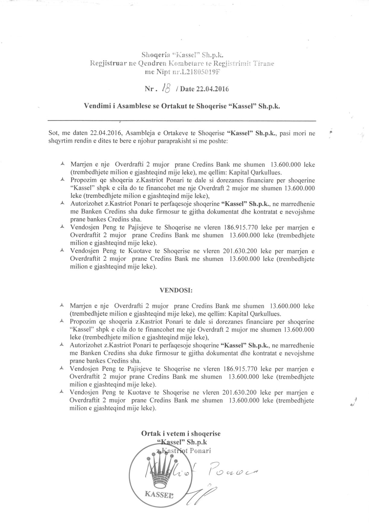 | Çështje Ligjore: | Kontratë “1 euro” Më datë 06.04.2016, me anë të Vendimit të Këshillit të Ministrave Nr. 260, u miratua lidhja e kontratës së qirasë me tarifën 1 euro/kontrata, ndërmjet Ministrisë së Zhvillimit Ekonomik, Turizmit, Tregtisë dhe Sipërmarrjes, si qiradhënës, dhe shoqërisë “Kassel” sh.p.k., si qiramarrës, për pasurinë “Objektet nr. 2 (ish-Fabrika e Tubave Rripave), nr. 14/a (ish-Reparti i kompresorëve), nr. 20 të ish-Ndërmarrjes “Goma”, Durrës”, në pronësi të shoqërisë “NPV” sh.a., Durrës, me sipërfaqe të përgjithshme, sipas genplanit, 9888.7 (nëntë mijë e tetëqind e tetëdhjetë e tetë pikë shtatë) m2 , nga të cilat sipërfaqe ndërtimore 6683.7 (gjashtë mijë e gjashtëqind e tetëdhjetë e tre pikë shtatë) m2 , si dhe sipërfaqe funksionale 3205 (tre mijë e dyqind e pesë) m2. Çështje Ligjore I. Më datë 22.04.2016, me vendim të ortakut të vetëm, u miratua marrja e një overdrafti 2 mujor pranë Credins Bank në shumën 13.600.000 (trembëdhjetë milion e gjashtëqind mijë) lekë, me qëëlim: Kapital qarkullues, dhe vendosja e peng e pajisjeve të shoqërisë në vlerën 186.915.770 (njëqind e tetëdhjetë e gjashtë milion e nëntëqind e pesëmbëdhjetë mijë e shtatëqind e shtatëdhjetë) lekë dhe vendosjen peng të kuotave të shoqërisë në vlerën 201.630.200 (dyqind e një milion e gjashtëqind e tridhjetë mijë e dyqind) lekë për marrjen e overdraftit. II. Më datë 26.04.2016, u nënshkrua marrëveshja e pengut Nr.615 Rep., Nr.215/2 Kol, e lidhur midis Banka Credins sha (Kolateralmarrës/Pengmarrës) dhe shoqërisë Kassel shpk, Kastriot Ponari (Kolateraldhënës/Pengdhënës) me objekt lënien peng të kuotave të kapitalit të shoqërisë Kassel shpk në favor të Kolateralmarrësit si garanci për përmbushjen e e detyrimit që rrjedh nga kontrata për overdraft Nr.1115/datë 26.04.2016, Nr. 614 Rep, Nr. 214 Kol datë 26.04.2016. III. Më datë 27.06.2016, me anë të Urdhërit Nr. 374 Prot, lëshuar nga Shoqëria Përmbarimore "LISI" sh.p.k., protokolluar nga QKB me Nr.3522 Prot., datë 28.06.2016, u urdhërua vënia e masës së sekuestros konservative në kuotat që zotëron KASSEL SHPK me NUIS L21805019F. Aktiviteti i tyre do të qëndrojë i bllokuar deri në një urdhër të dytë. Nuk do të kryhet asnjë veprim tjetër që mund të ndryshojë të dhënat në regjistrin tregtar. IV. Më datë datë 07.07.2016, me anë të Urdhërit Nr. 407 Prot, lëshuar nga Shoqëria Përmbarimore "LISI" sh.p.k., protokolluar nga QKB me Nr.4005 Prot., datë 11.07.2016, u urdhërua heqja e masës së sekuestros konservative dhe lirimi i pasurive sende të luajtshme dhe të paluajtshme etj të ish palës debitore person juridik KASSEL SHPK me NUIS L21805019F, me administrator Kastriot Ponari. V. Më datë 30.12.2016, u nënshkrua Kontrata e Pengut Nr. 1245/2., e lidhur midis :“Banka CREDINS” sh.a, në cilësinë e pengmarrësit dhe “Kassel” sh.p.k, në cilësinë e pengdhënësit, me objekt krijimin e një pengu, ku pengdhënësi lë peng në favor të Bankës kuotat e kapitalit të shoqërisë “Kassel” sh.p.k, për garantimin e detyrimeve që rrjedhin nga Kontrata e Overdraftit Nr. 1245., datë 30.12.2016, Nr. 5854 Rep, Nr.2240 Kol., date: 30.12.2016 ndërmjet Bankës në cilësinë e kredidhënësit dhe “Kassel” sh.p.k në cilësinë e kredimarrësit. VI. Më datë 30.06.2017, u nënshkrua marrëveshja siguruese Nr. 3068 Rep., Nr. 1118 Kol., lidhur midis Kassel sh.p.k, Kastriot Ponari (Barrdhënës) dhe Banka Credins sh.a (Barrëmarrës), me objekt krijimin e një barre siguruese mbi pasuritë e luajtshme të barrëdhënësve, si garanci për huanë e akorduar nga Banka Credins në bazë të kontratës së overdraftit nr. 1331, datë 30.06.2017 Nr. 30677 Rep., Nr. 1117 Kol., datë 30.06.2017. VII. Më datë 16.03.2018, u nënshkrua marrëveshja siguruese Nr. 1358 Rep dhe 583 Kol, lidhur midis shoqërisë tregtare “Kassel”shpk si barrëdhënës dhe Kastriot Ponari (barrëdhënës) dhe Banka “Credin”sha si (barrëmarrës) për krijimin e një barre siguruese mbi pasuritë e luajtshme të barrëdhënësit, si garanci për shlyerjen e kredisë së akorduar nga Banka Credins në baze të Kontratës për Kredisë Nr. 1463 datë 16.03.2018 Nr. 1356 Rep dhe Nr. 581 Kol datë 16.03.2018. VIII. Më datë 06.11.2018, me anë të Urdhrit Nr. 4668 Prot., Nr. 187-18 Regj "Urdhër për Vënien e Sekuestros Konservative", lëshuar nga Shërbimi Përmbarimor Gjyqësor “ASTREA” , u urdhërua vendosja e sekuestros në QKB mbi aktivet që zotëron debitori subjekti "Kassel" shpk, pajisur me NUIS (NIPT) L21805019F deri në një urdhër të dytë të Përmbaruesit Gjyqësor. IX. Më datë 12.11.2018, me anë të Urdhrit Nr. 4704 Prot, Nr. 187-18 Regj "Urdhër për Heqjen e masës së sekuestros Konservative", lëshuar nga Shërbimi Përmabrimor "ASTREA", protokolluar nga QKB me Nr.12897 Prot, datë 13.11.2018, u urdhërua heqja e masës së sekuestros konservative të vendosur me anë të Urdhërit Nr.4668 Prot, datë 06.11.2018 në aktivet e debitorit, shoqëria "Kassel" shpk me NIPT L21805019F. X. Më datë 05.12.2018, me anë të urdhrit Nr.1273 Prot., Nr. 297 Dosje, lëshuar nga shoqëria përmbarimore private “T.M.A” sh.p.k, u urdhërua vendosja e masës së sekuestros konservative mbi 100 % të kuotave që Kastriot Ponari zotëron në shoqërinë “Kassel” sh.p.k, dhe të drejtave që lidhen me to, si dhe mbi kuotat e reja që mund të gëzojë në të ardhmen në këtë shoqëri tregtare, sipas marrëveshjes siguruese Nr.1463, datë 16.03.2018, Nr.1358 Rep., Nr.583 Kol. XI.Sipas Urdherit te lëshuar date 04.11.2020, eshte vendosur: masa e sekuestros mbi pasurinë e luajtshme te vlerës prej 100% te aksioneve te tashme dhe të ardhshme ne pronësi te shoqërise “Kassel ” SHPK, me Nipt L21805019F. XII. Me datë 12.01.2022, me anë të Kërkesës Nr. 24 Prot,
