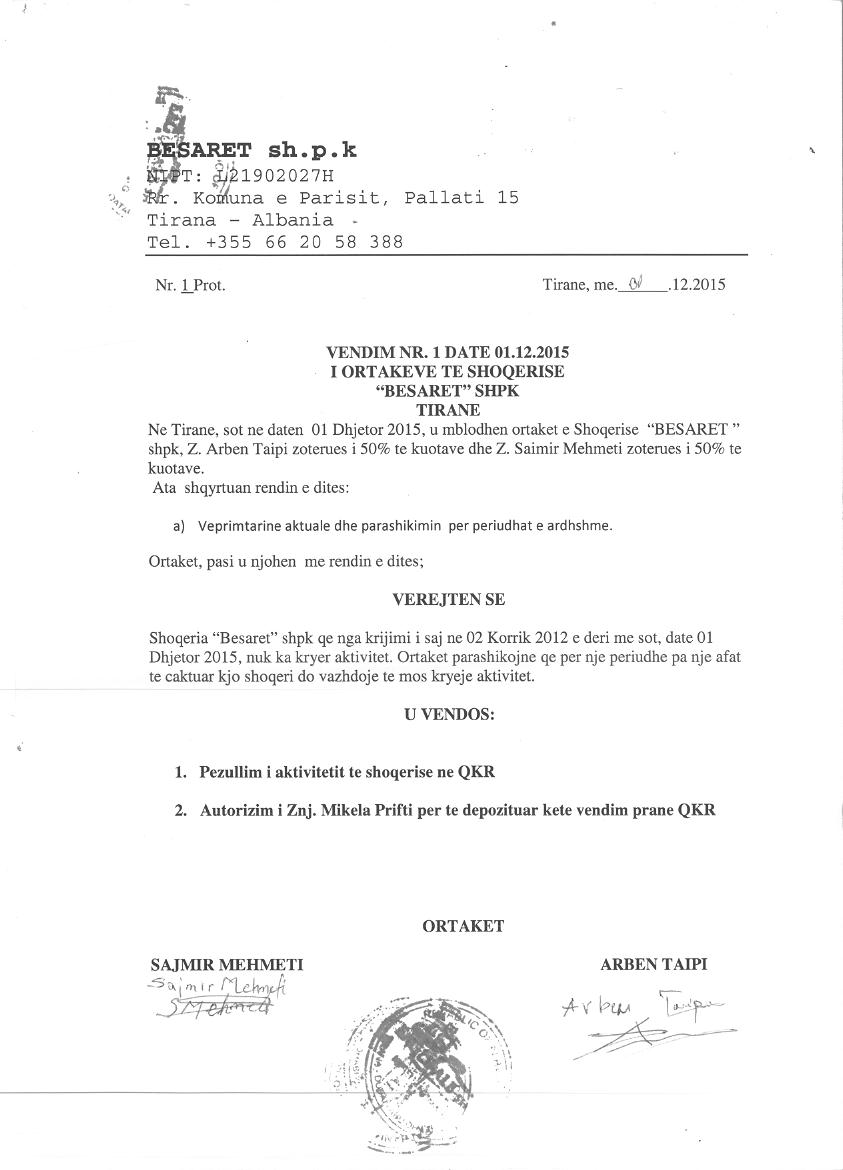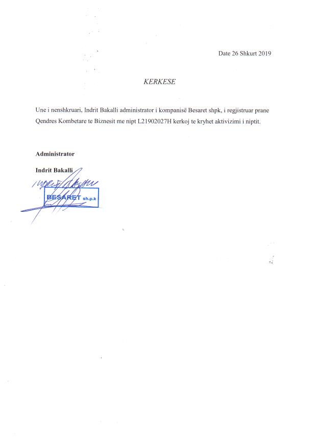 → Ekstrakt historik i regjistrit tregtar 30.10.2020 → Statuti i shoqerise → Kontrate shitje kuotash 30.01.2019 → Kerkesa e administratorit per aktivizimin e Nipt-it 26.02.2019 → Vendimi i ortakeve per pezullimin e aktivitetit 01.12.2015 → Ekstrakt Historik i Regjistrit Tregtar date 10.04.2023 |