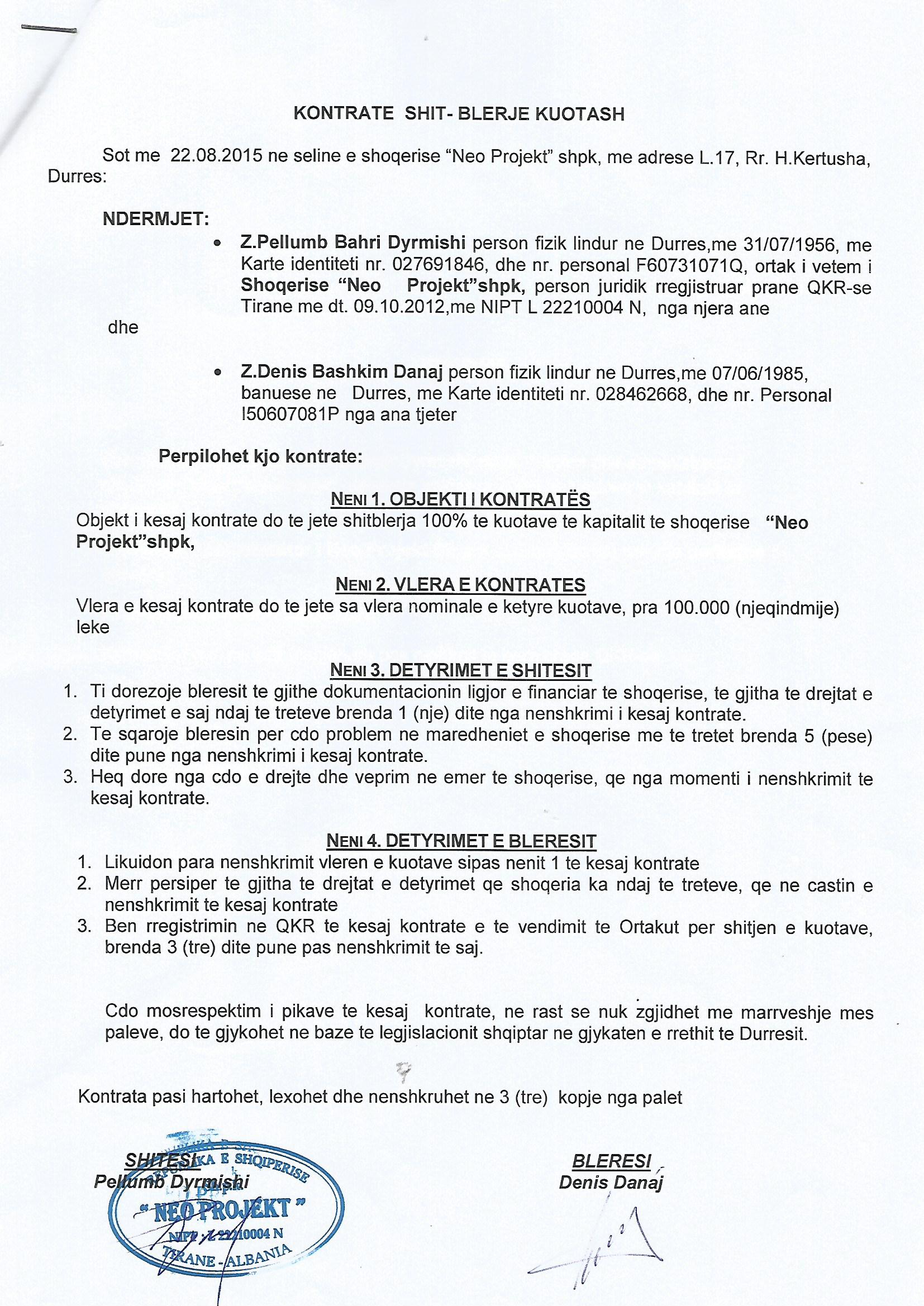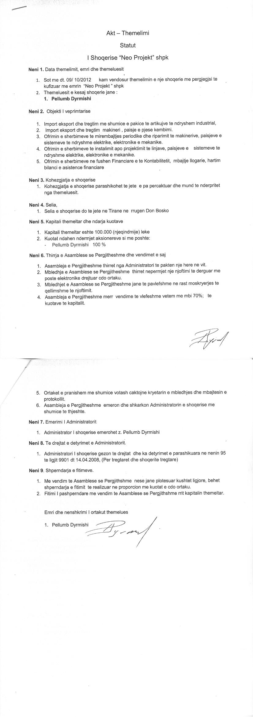 → Ekstrakt Historik i Regjistrit Tregtar date 20.02.2023 → Akt themelimi dhe Statuti i Shoqerise → Kontrate Shitblerje Kuotash date 22.08.2015 → Vendim i Ortakut te Vetem, Zmadhim Kapitali date 22.06.2022 |