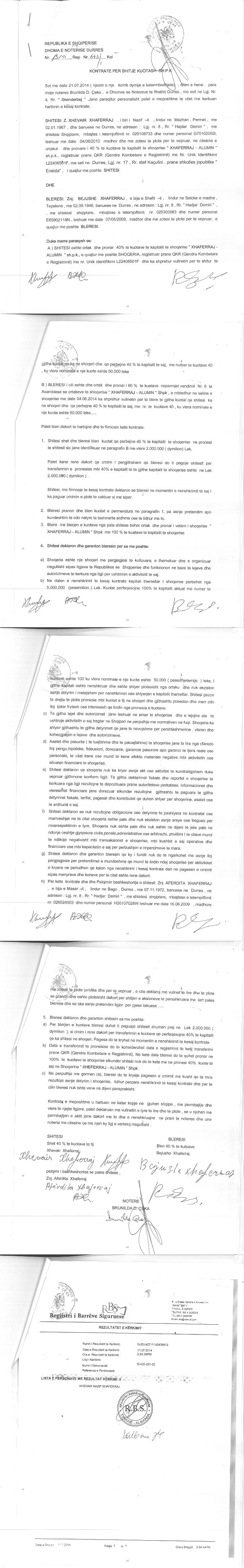 → Ekstrakti Historik i Regjistrit Tregtar date 16.08.2024 → Akti i themelimit te Shoqerise → Kontrate e shitjes se kuotave date 05.12.2013 → Kontrate e shitjes se kuotave date 21.07.2014 → Kontrate e dhurimit te kuotave date 27.01.2017 → Kontrate Para Martesore date 11.07.2019 |