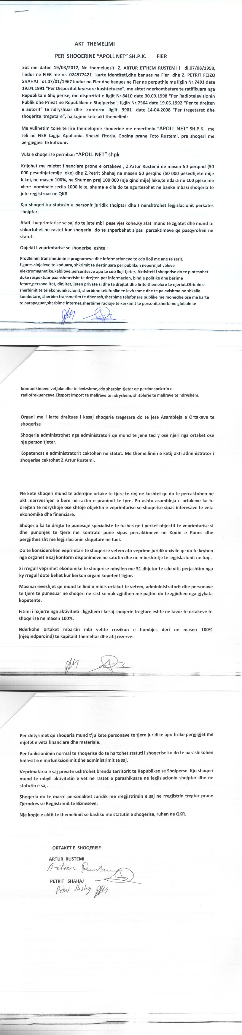 | Objekti i Veprimtarisë: | Prodhimin transmetimin e programeve dhe informacioneve te cdo lloji me ane te zerit, figures,sinjaleve te koduara, shkrimit te destinuara per publikun nepermjet valeve elektromagnetike,kabllove,perseritesve apo te cdo lloji tjeter. Aktiviteti I shoqerise plotesohet duke respektuar paanshmerisht te drejten per informacion, bindje politike dhe besime fetare,personalitet, dinjitet, jeten private si dhe te drejtat dhe lirite themelore te njeriut.Eksport import te mallrave te ndryshem, shitblerjen e mallrave te ndryshem me qellim realizimin e aktivitetin te kompanise.Ofrimin e sherbimit te telekomunikacionit, sherbime telefonike te levizshme dhe te palevizshme ne shkalle kombetare, sherbim trasmetim te dhenash, internet, data, sherbime telefonare publike me monedhe ose me karte te parapaguar, sherbime globale te komunikimeve vetjake dhe te levizeshme, cdo sherbim tjeter qe perdor spektrin e radiofrekuencave. |