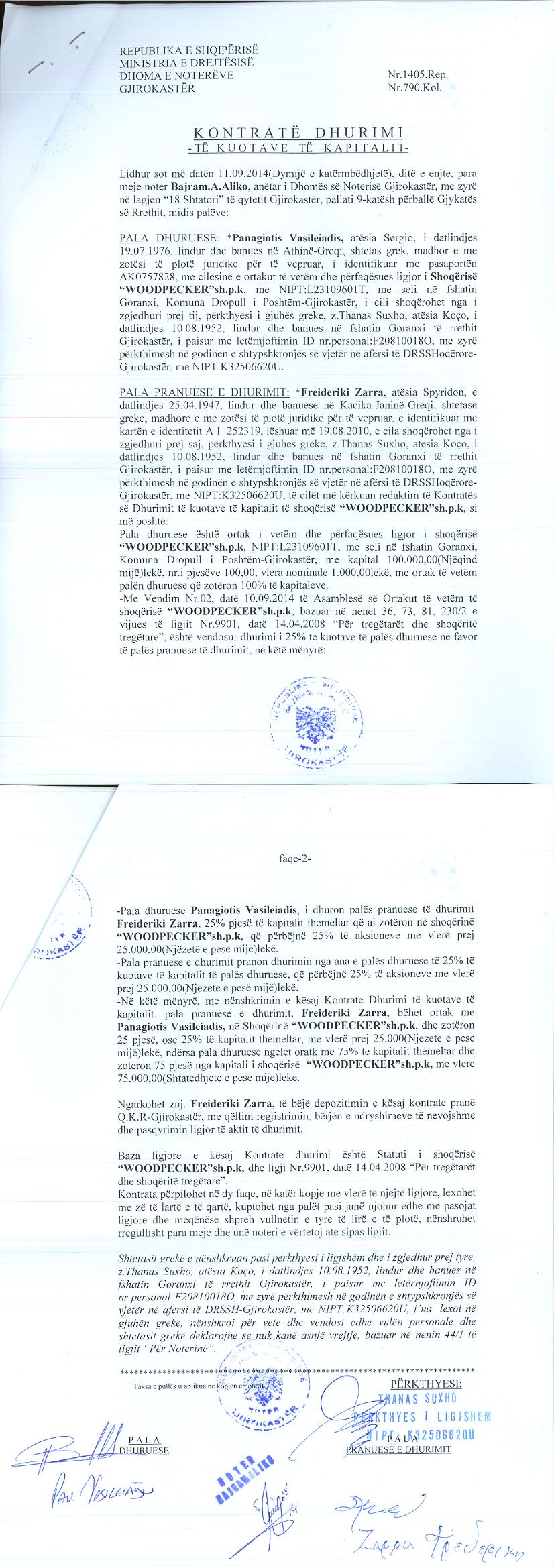 me NUIS (NIPT) L23109601T dhe dorezanesve Freideriki Zarra ne kuotat dhe aksionet qe