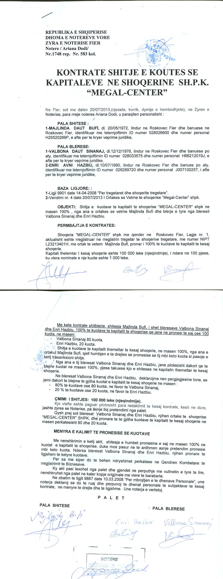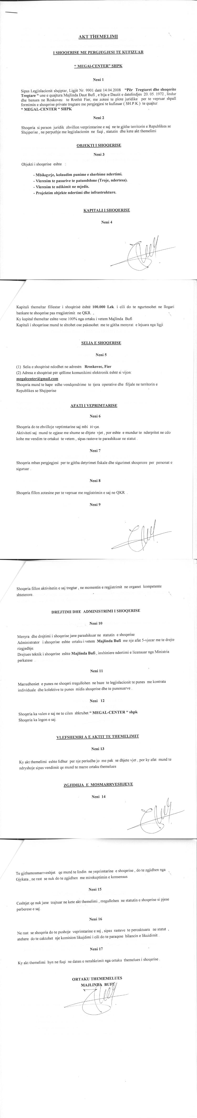 → Ekstrakti Historik i Regjistrit Tregtar date 24.05.2023 → Akt themelimi i Shoqerise → Kontrate Shitje Kuotash date 20.07.2013 → Vendim i Asamblese se Ortakeve, Likuidim Shoqerie date 28.12.2015 → Vendim i Asamblese se Ortakeve, Cregjistrim Shoqerie date 18.03.2019 → Akt Likuidimi i Shoqerise |