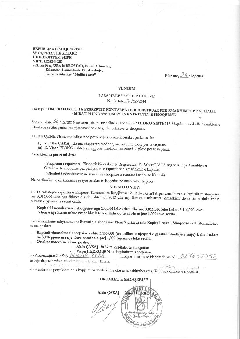 → Ekstrakt Historik i Regjistrit Tregtar date 05.06.2024 → Akt themelimi i Shoqerise → Vendim i Asamblesë së Ortakëve, Zmadhim Kapitali datë 24.12.2014 → Vendim i Ortakëve të Shoqërisë, Zmadhim Kapitali datë 15.09.2023 |