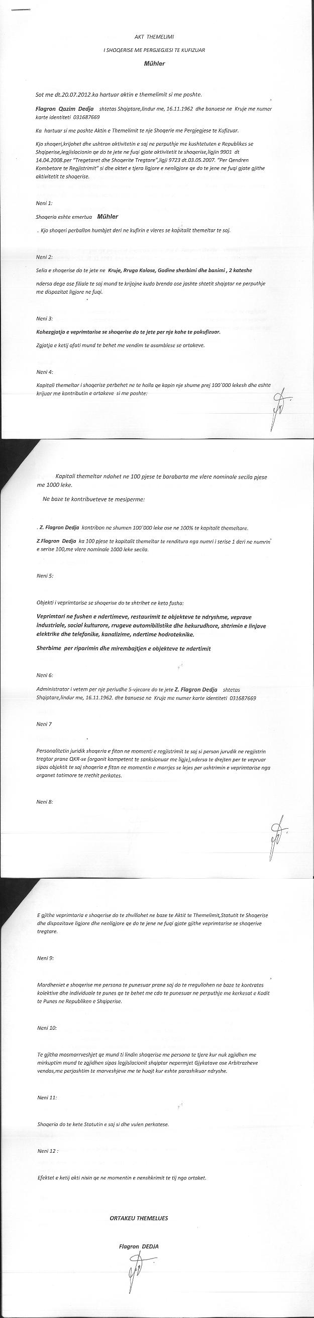 → Ekstrakt Historik i Regjistrit Tregtar date 16.10.2023 → Akt themelimi i Shoqerise → Kontratë Dhurimi datë 05.11.2019 → Ekstrakt Historik i Regjistrit Tregtar date 17.04.2024 → Të dhënat e Investimit, Financimet Nga IPARD - Aksesuar nga Agjencia për Zhvillim Bujqësor dhe Rural AZHBR datë 17.04.2024 |