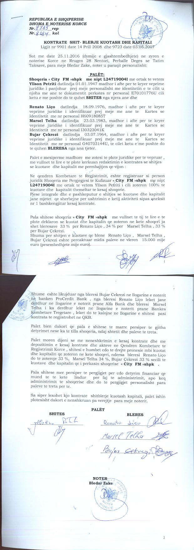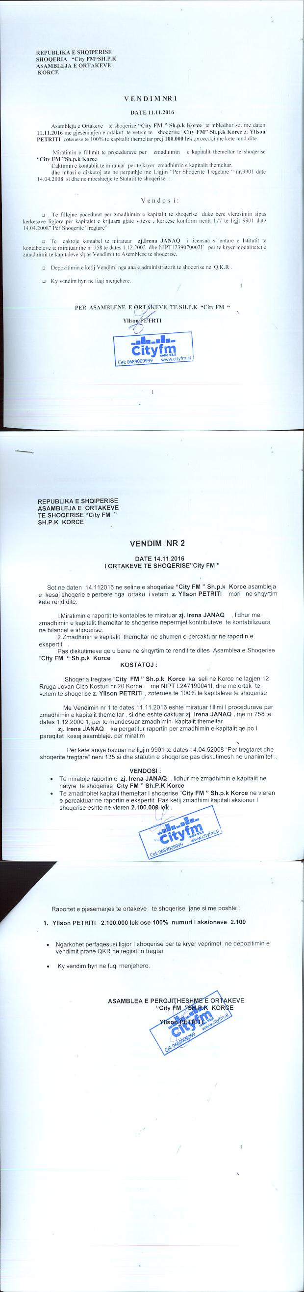 → Ekstrakt historik i regjistrit tregtar date 21.01.2023 → Akti i themelimit → Kontrate shitblerje kuotash kapitali date 25.11.2016 → Vendim i ortakut te vetem per zmadhimin e kapitalit date 22.11.2018 → Vendimi i ortakut te vetem per zmadhimin e kapitalit date 11.11.2016 |