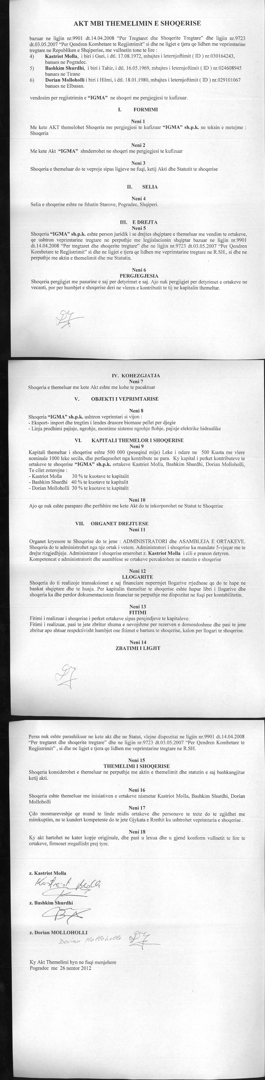 | Objekti i Veprimtarisë: | Eksport-Import dhe tregtimi i lendes drusore biomase pellet për djegie. Linja prodhimi pajisje, ngrohje, montime, sisteme ngrohje ftohje, pajisje elektrike hidraulike. Ndërtime civile, punime speciale ndërtimi, ndërtime ujësjellësa, punime montimi në linjat e TN e të mesëm dhe shpërndarjen e energjisë elektrike. |