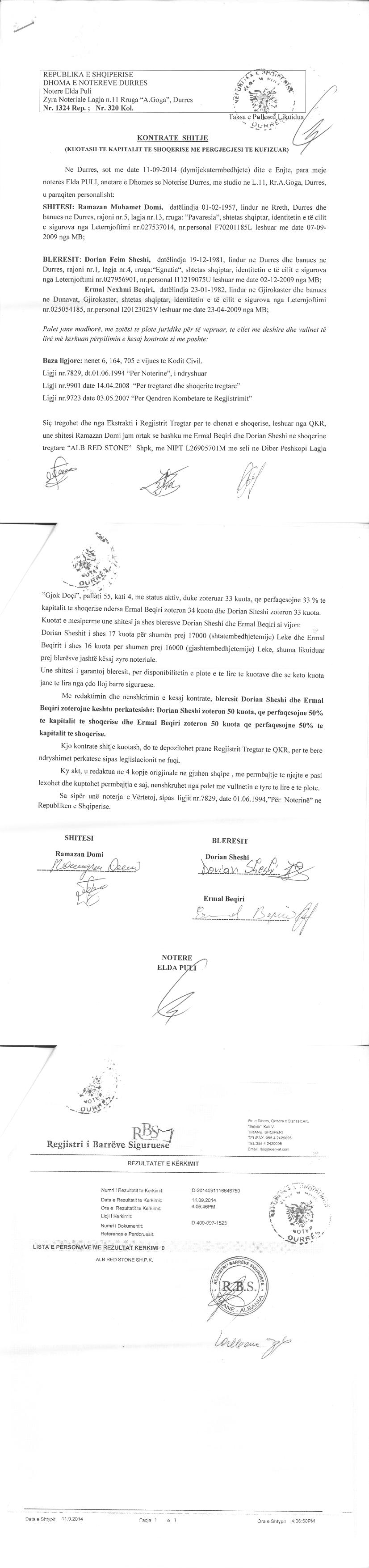 Ramazan Muhamet Domi pranë shoqërive të tjera të regjistruara. II. Me datë 04.02.2019, me anë të Urdhrit Nr.656 Prot., Nr.156 Dosje "Urdhër për Vendosjen e Sekuestros Konservative", lëshuar nga Shoqëria Përmbarimore " E.P.S.A" SHPK, protokolluar nga QKB me Nr.2062 Prot, datë 06.02.2019, u urdhërua: Bllokimi i aksioneve, kuotave dhe e te drejtave qe rrjedhin nga zoterimi kuotave per debitoret shoqëria " ALB RED STONE " SHPK me NIPT L26905701M dhe Dorian Sheshi , ne cilesine e Administratorit, deri në një urdhër të dytë nga përmbaruesi gjyqësor. |