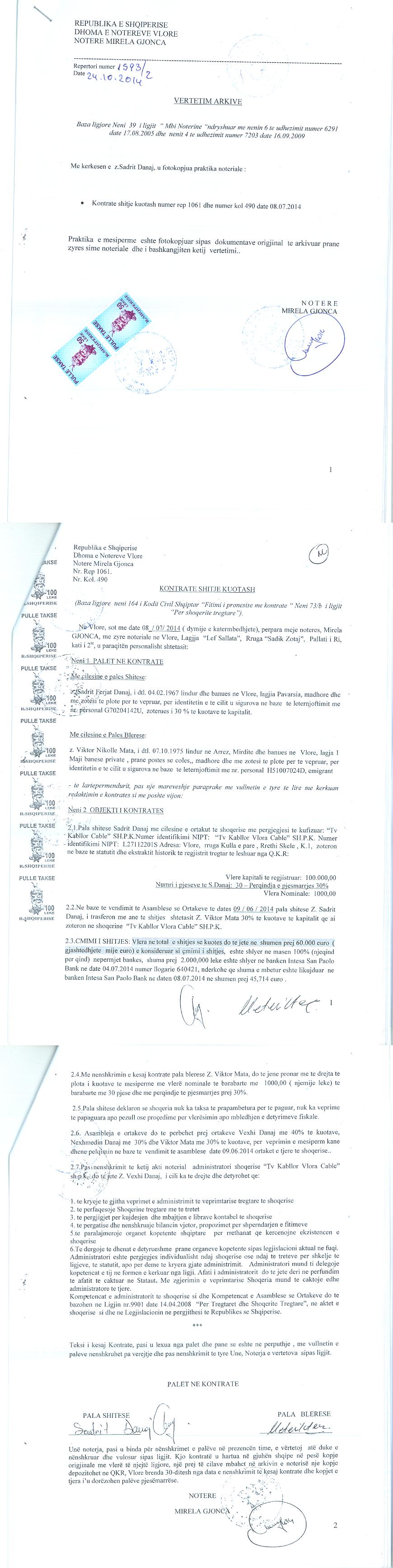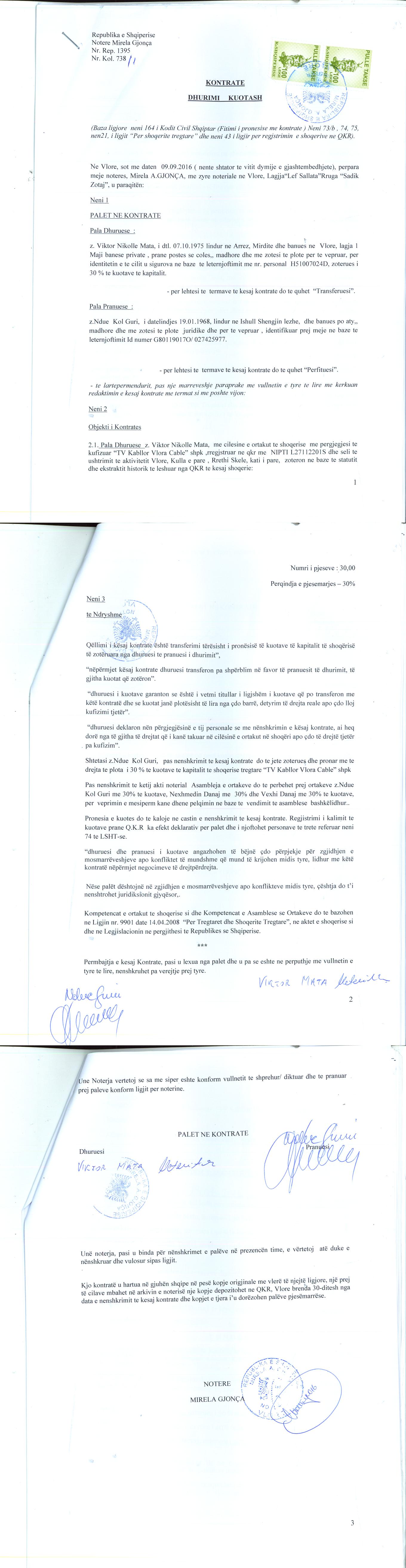 | Çështje Ligjore: | I. Me datë 12.10.2015, me ane te Urdhërit Nr.4256/4 Prot, protokolluar nga QKR me Nr. 9247 Prot., date 20.10.2015 "Për Vënien e Sekuestros Konservative”, lëshuar nga Shoqëria Përmbarimore"HOTI BAILIFF SERVICE", drejtuar QKR, u urdherua vendosja e masës sekuestro konservative mbi te gjitha aksionet e zoteruara nga debitori Shoqeria "Tv Kabllor Vlora Cable" Shpk, me Nipt L27112201S,