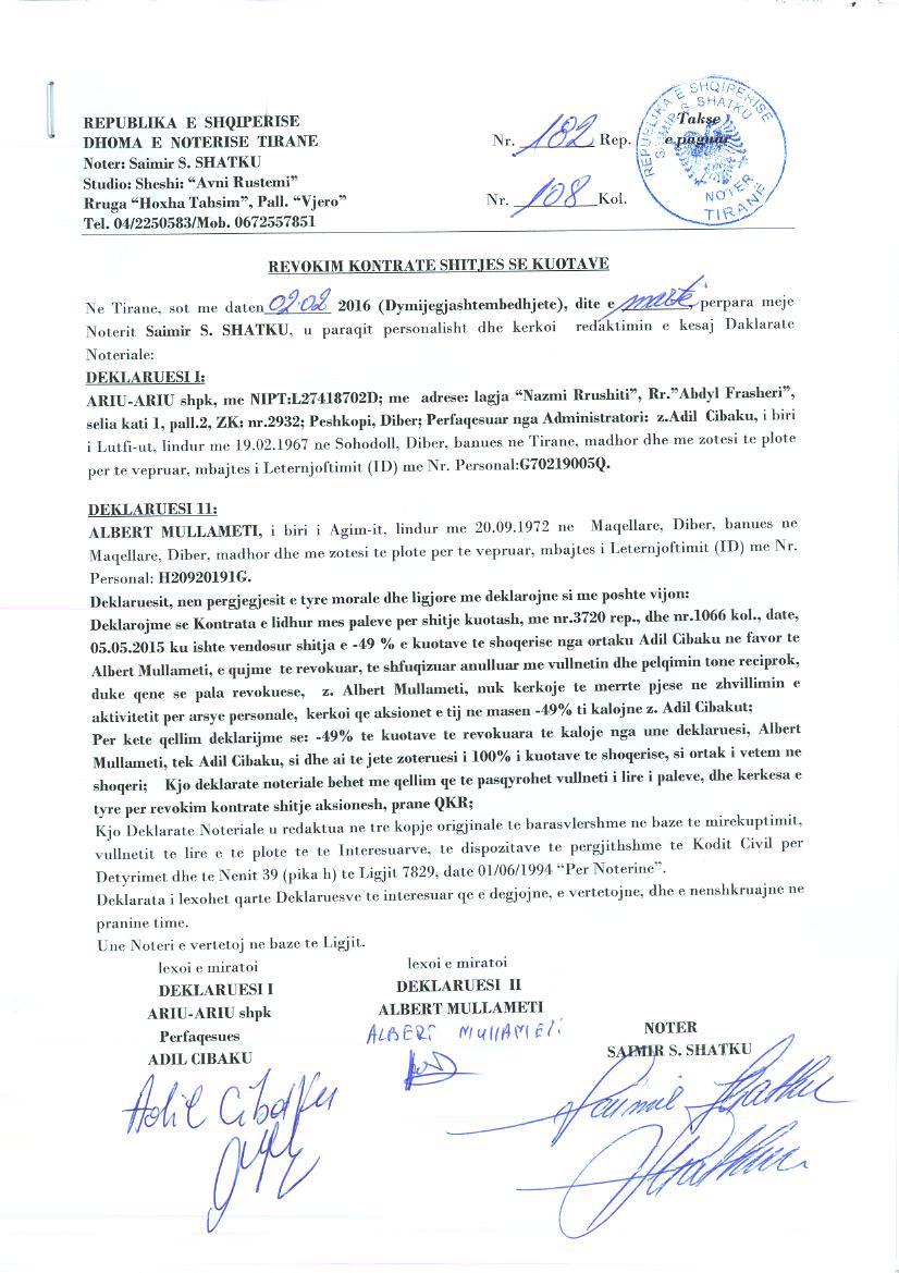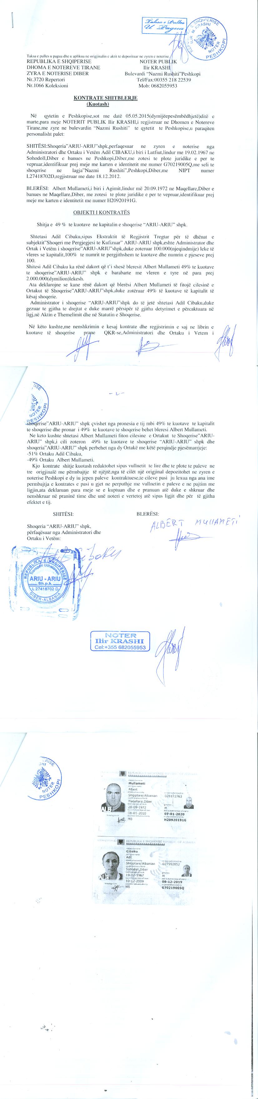 → Ekstrakti Historik i Regjistrit Tregtar date 16.11.2021 → Statuti i Shoqerise → Kontrate e Shit-Blerjes se Kuotave date 05.05.2015 → Revokim te kontrates se shitjes se kuotave date 02.02.2016 → Kontrate e Shit-Blerjes se Kuotave date 10.10.2018 |
