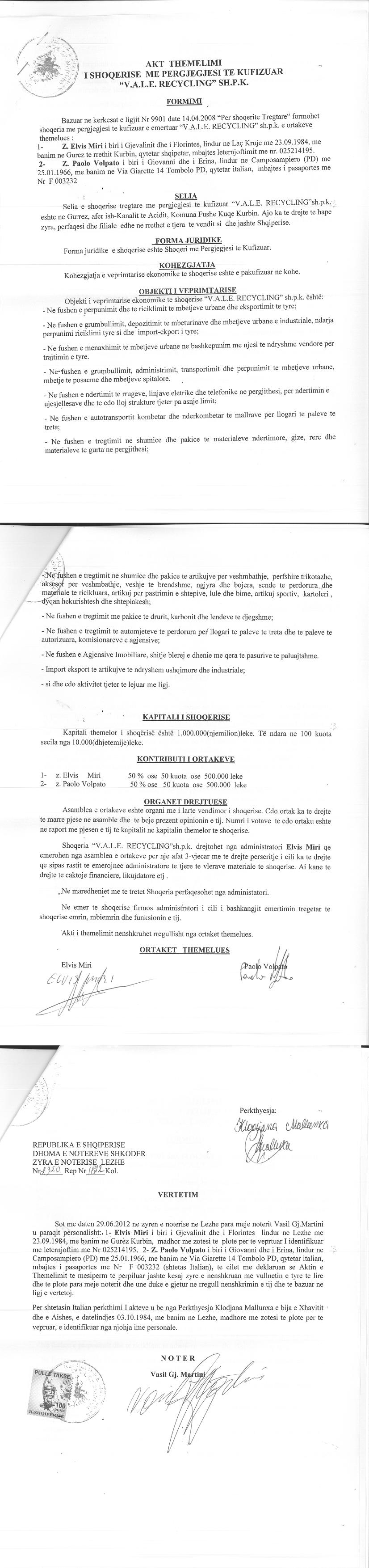 | Objekti i Veprimtarisë: | Ne fushen e perpunimit dhe te riciklimit te mbetjeve urbane dhe eksportimit te tyre.Ne fushen e grumbullimit,depozitimit te mbetjeve urbane e industriale, ndarja perpunimi riciklimi tyre si dhe import-eksport i tyre.Ne fushen e menaxhimit te mbetjeve urbane ne bashkepunim me njesi te ndryshme vendore per trajtimin e tyre.Ne fushen e grumbullimit,administrimit,transportimit dhe perpunimit te mbetjeve urbane,mbetjeve te posaçme dhe mbetjeve spitalore.Ne fushen e ndertimit te rrugeve,linjave elektrike dhe telefonike ne pergjiyhesi,per ndertimin e ujsjellesave dhe te cdo lloj strukture tjeter pa asnje limit.Ne fushen fushen e autotransportit kombetar dhe nderkombetar te mallrave per llogari te paleve te treta.Ne fushen e tregtimit me shumice dhe pakice te materialeve ndertimore,gize, rere dhe materialeve te gurta ne pergjithesi.Ne fushen e trgtimit me shumice dhe pakice te artikujve per veshmbathje,perfshire trikotazhe,aksesor per veshmbathje,veshje te brendshme,ngjyra dhe bojra, sende te perdorura dhe materiale te ricikluara,artikuj per pastrimin e shtepive,lule dhe bime,artikuj sportiv,kartoleri,dyqan hekurishtesh dhe shtepiakesh.Ne fushen e tregtimit me pakice te 2 drurit,karbonit lendeve te djegshme.Ne fushen e tregtimit te automjeteve te perdorura per llogari te paleve te treta dhe te paleve te autorizuara,komisionareve e agjensive.Ne fushe e agjensive imobiliare,shitje blerje e dhenie me qera te pasurive te palujtshme.Import eksport te artikujve te ndyshem ushqimore dhe industriale,si dhe cdo aktivitet tjeter te lejuar me ligj.Sherbime avokatie dhe konsulence Juridike me nr License 9850. Dizenfektim te ambjenteve te ndryshme ( spitale, qendrave shendetesore, klinikave, laboratoreve etj. ) Pastrim, larje, sprucim ose veshje e mbetjeve te amballazheve, paketimeve ose kontenjereve ne menyr qe te riperdoren, si larje, pastrim, dezinfiktim, mirmbajtje e kontinjereve te mbetjeve urbane dhe spitalore. Mirembajtjen e siperfaqeve te gjelbrerta. |