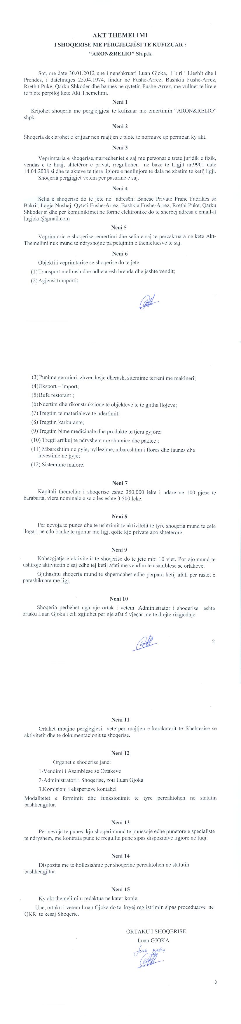 | Emërtime të tjera Tregtare: | "ARON&RELIO" SH.P.K |
