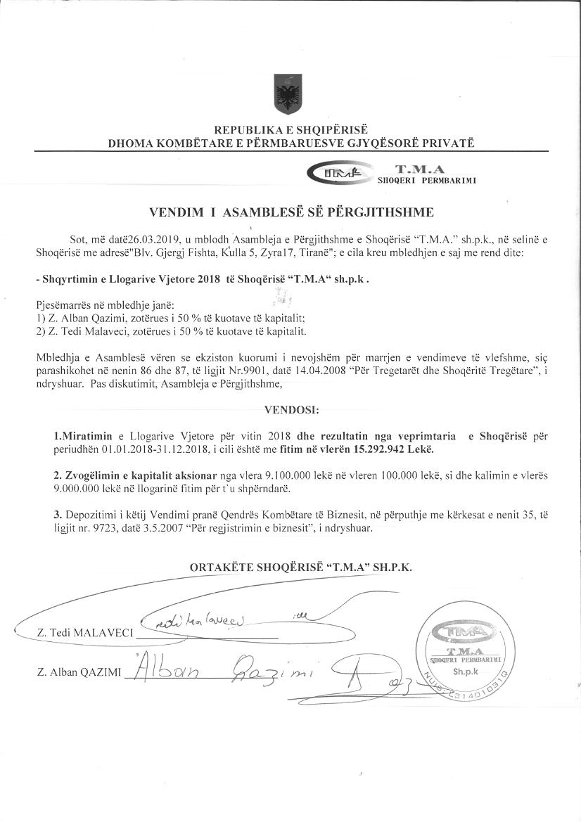 | Emërtime të tjera Tregtare: | "Zyra e Përmbarimit Privat T.M.A" |