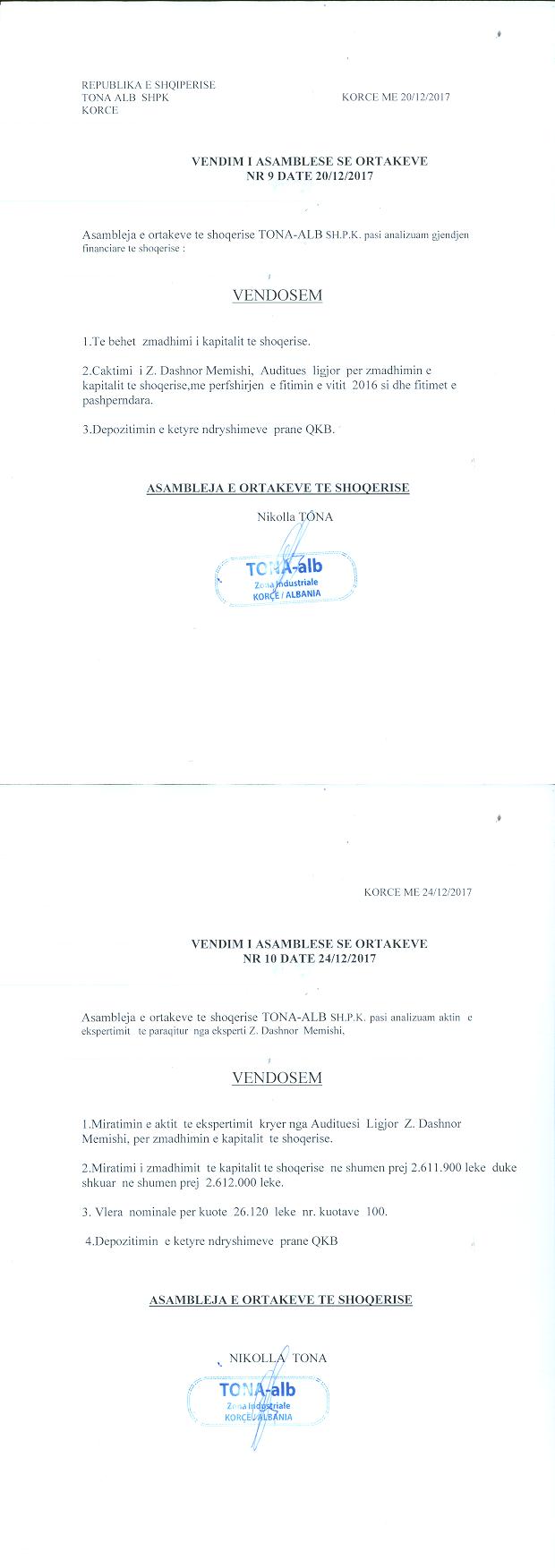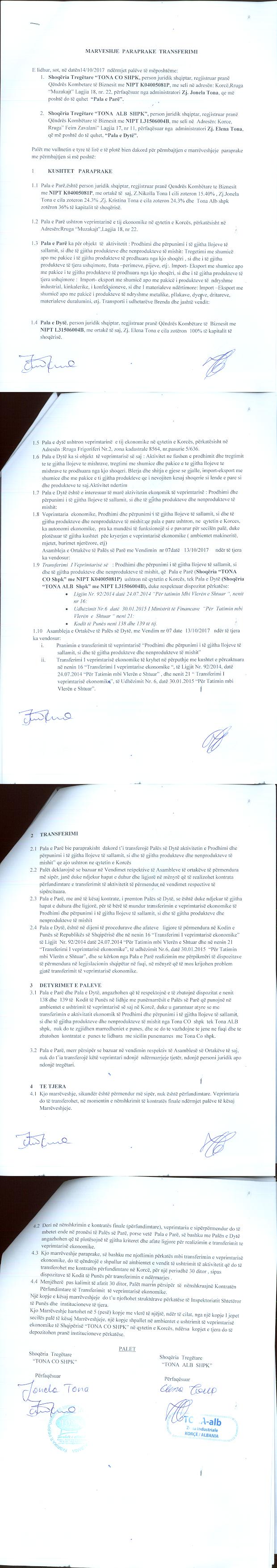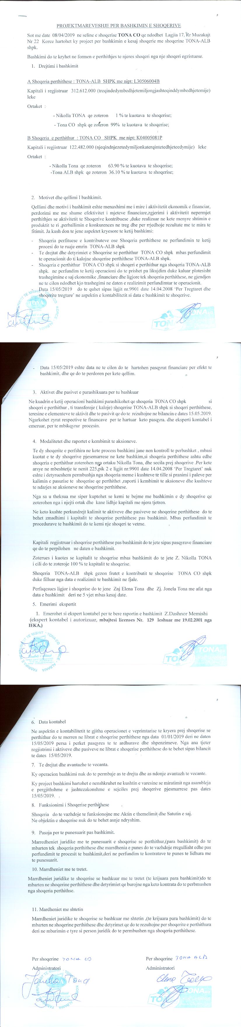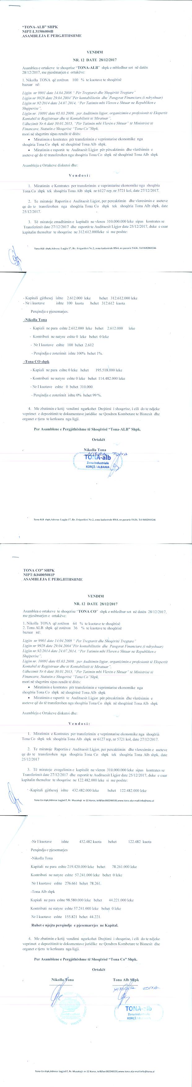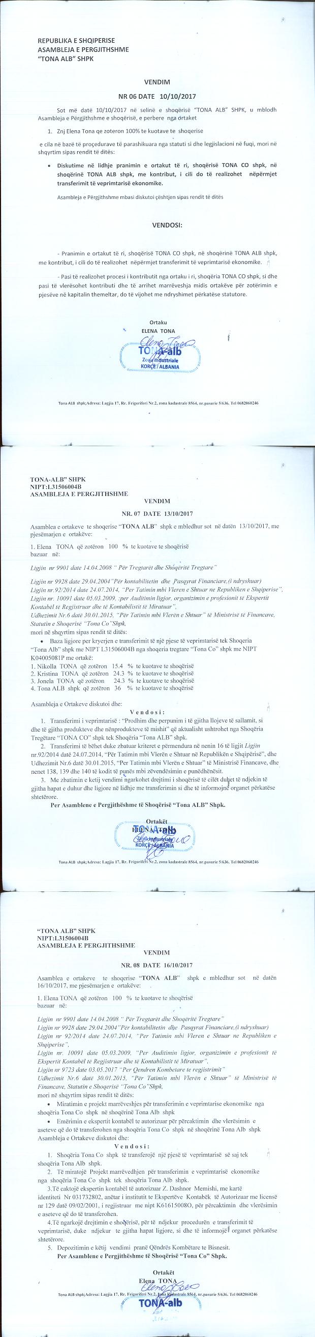 → Ekstrakt Historik i Regjistrit Tregtar date 17.10.2023 → Akt themelimi i Shoqerise → Vendim i Asamblesë së Përgjithshme, Pranimi i Ortakut të Ri datë 10.10.2017 → Marrëveshje Paraprake e transferimi datë 14.10.2017 → Kontratë Dhurimi datë 14.11.2017 → Kontratë transferimi të Veprimtarisë Ekonomike të Shoqërisë datë 27.12.2017 → Vendim i Asamblesë së Ortakëve, Zmadhim Kapitali datë 20.12.2017 → Vendim i Asamblesë së Ortakëve, Zmadhim Kapitali datë 28.12.2017 → Marrëveshje Siguruese datë 14.02.2018 → Projekt Marrëveshje për Bashkimin e Shoqërive "Tona - Alb" shpk dhe "Tona Co - Shpk" datë 08.04.2019 → Marrëveshja e Bashkimit me Përthithje ndërmjet "Tona - Alb" shpk dhe "Tona Co - Shpk" datë 22.05.2019 → Ekstrakt Historik i Regjistrit Tregtar date 17.04.2024 → Të dhënat e Investimit, Financimet Nga IPARD - Aksesuar nga Agjencia për Zhvillim Bujqësor dhe Rural AZHBR datë 17.04.2024 |