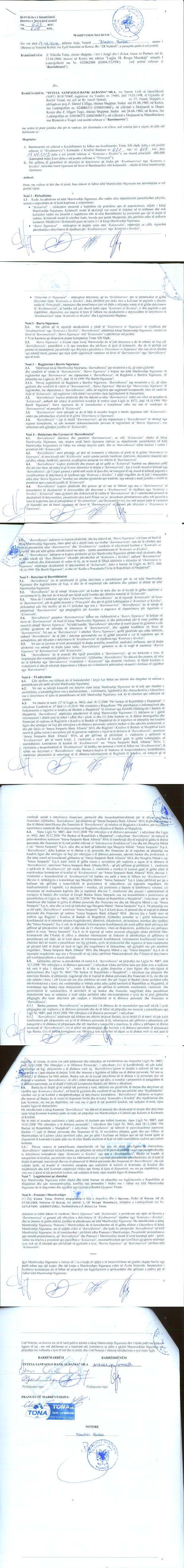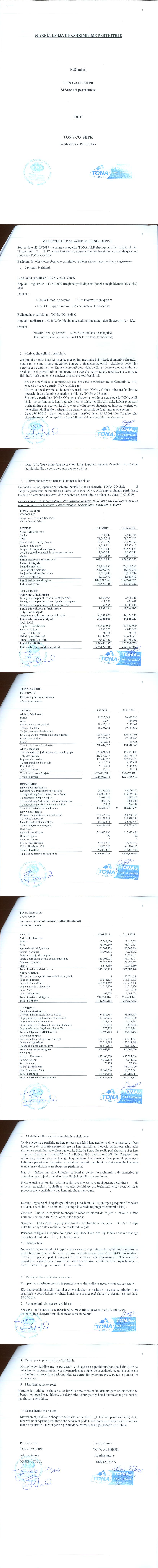Kol. midis Nikolla Tona (barrëdhënës) dhe "Intesa Sanpaolo Bank Albania" sh.a (barrëmarrës), ku barrëdhënësi, nëpërmjet kësaj marrëveshje, vendos në favor të barrëmarrësit, "barrë siguruese" mbi 1% të kuotave që disponon pranë kompanisë "Tona - Alb" shpk. II. Me datë 10.10.2017, me vendim të asamblesë së përgjithshme, u vendos pranimi i ortakut të ri, shoqërisë "Tona Co - Shpk", në shoqërinë "Tona - Alb" shpk, me kontribut nëpërmjet transferimit të veprimtarisë ekonomike dhe u nënshkrua marrëveshja paraprake e transferimit datë 14.10.2017. Bashkimi me Përthithje I. Me datë 08.04.2019, u miratua dhe u nënshkrua Projekt Marrëveshja për Bashkimin e Shoqërive Tregtare "Tona - Alb" shpk (shoqëria përthithëse) dhe "Tona Co - Shpk" (shoqëria e përthithur). II. Me datë 22.05.2019, u nënshkrua marrëveshja e Bashkimit me Përthithje ndërmjet "Tona - Alb" shpk (si shoqëri përthithëse) dhe "Tona Co - Shpk" (si shoqëri e përthithur). Në përfundim të procesit të drejtat dhe detyrimet e shoqërisë së përthithur "Tona Co - Shpk" do transferohen në favor të shoqërisë përthithëse; kapitali i shoqërisë përthithëse do të bëhet 442.600.000 lekë; dhe shoqëria e përthithur "Tona Co - Shpk" do të pushoj së ekzistuari duke u çregjistruar nga QKB. |