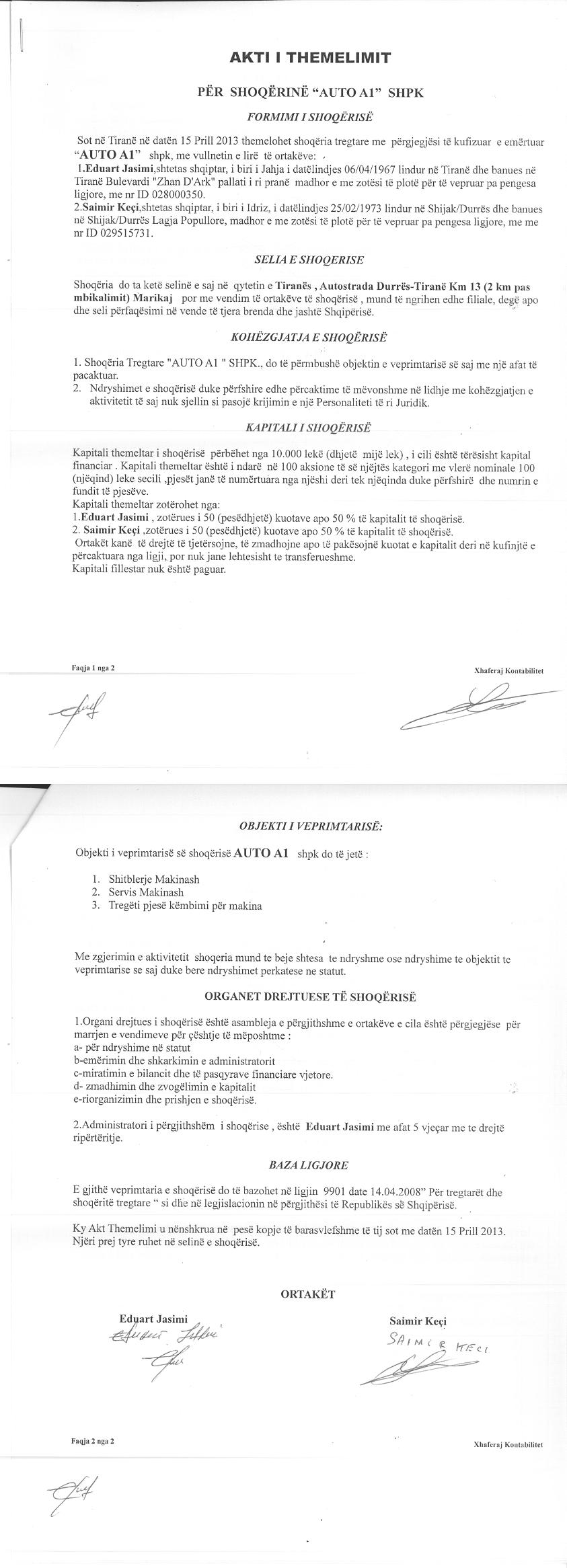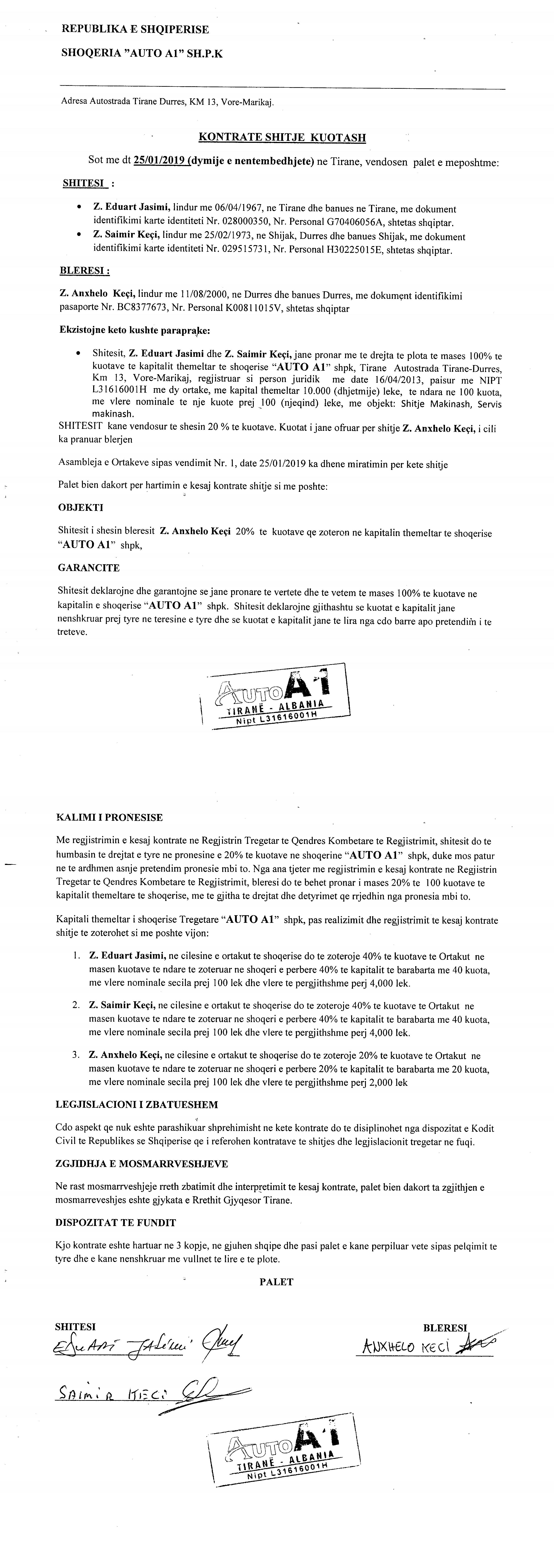 → Ekstrakti Historik i Regjistrit Tregtar date 08.12.2021 → Akti i themelimit te Shoqerise → Kontrate e shitjes se kuotave date 25.01.2019 → Kontrate e shitjes se kuotave date 06.05.2020 |