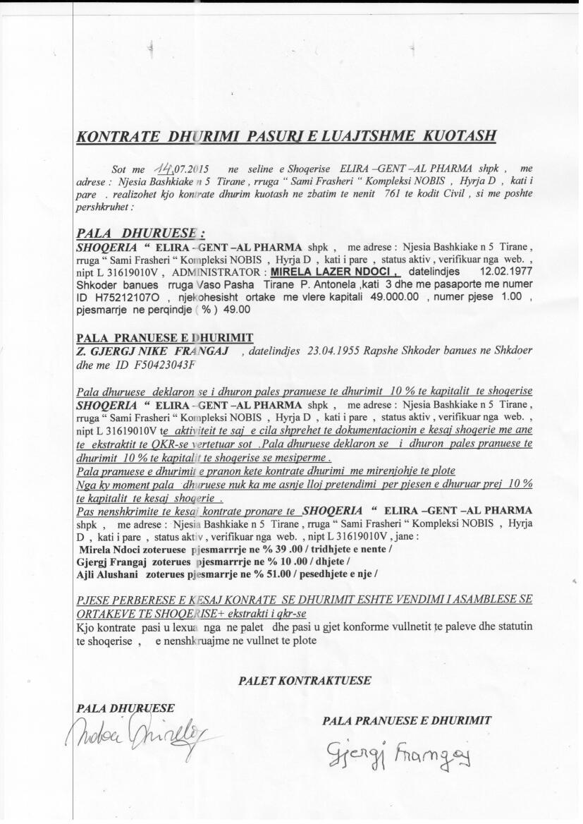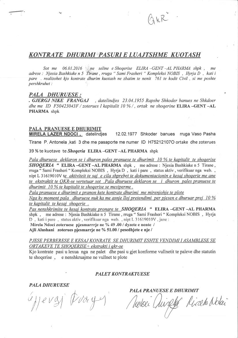 → Ekstrakti Historik I Regjistrit Tregtar date 23.09.2020 → Statuti I Shoqerise → Kontrate e Dhurimit te Kuotave date 14.07.2015 → Kontrate e Dhurimit te Kuotave date 06.01.2016 |