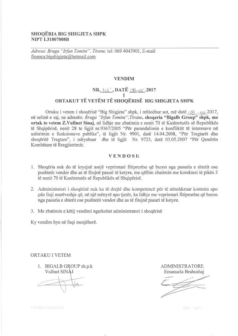 | Çështje Ligjore: | Me datë 08.05.2017, me Vendim Nr. 1/5 të Asamblesë së Zakonshme, u vendos që Shoqeria nuk do te kryeje asnje veprimtari fitimprurese qe buron nga pasuria e shtetit ose pushteti vendor dhe as te fitoje pasuri te ketyre , me qellim zbatimin me korrektesi te pikes 3 te nenit 70 te Kushtetutes se Republikes se Shqiperise. Administratori i shoqerise nuk ka te drejte dhe kompetence per te nenshkruar kontrata apo cdo lloji mareveshje qe, ne nje menyre apo tjeter, ka lidhje me veprimtari fitimprurese qe buron nga pasuria e shtetit ose pushtetit vendor dhe as te fitoje pasuri te ketyre. |