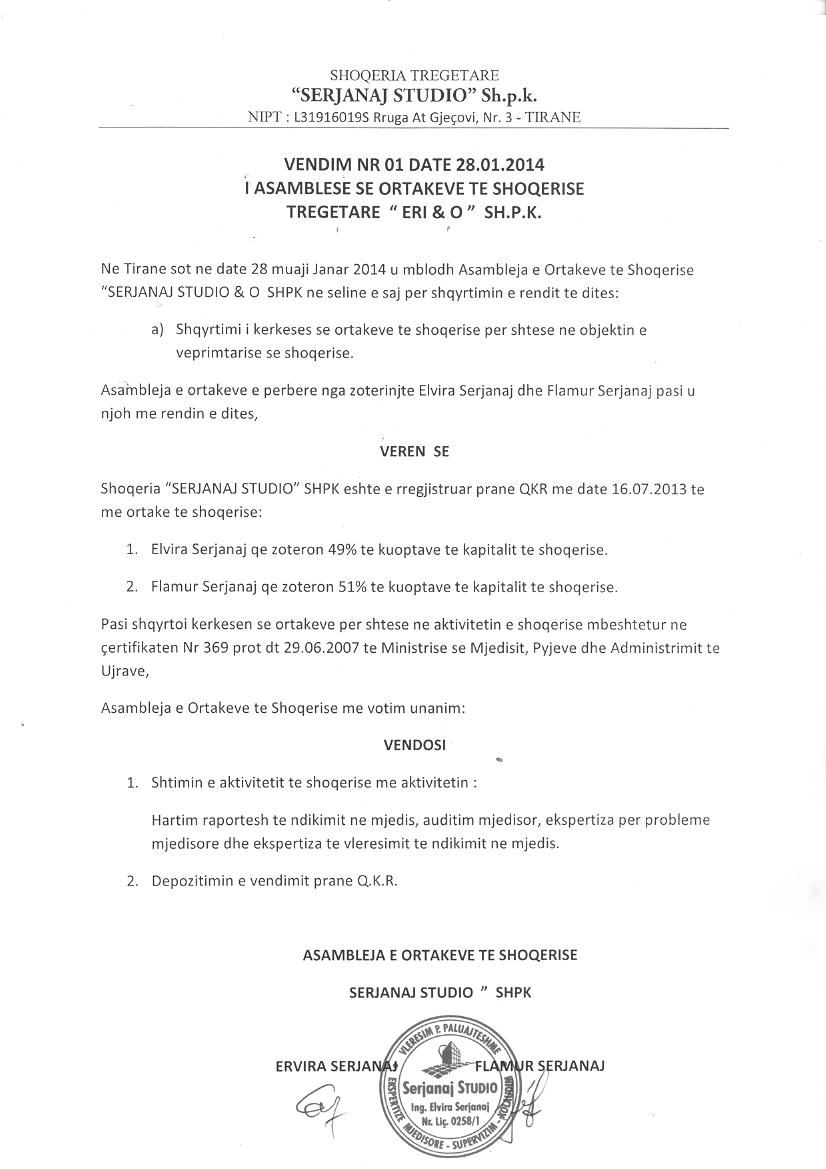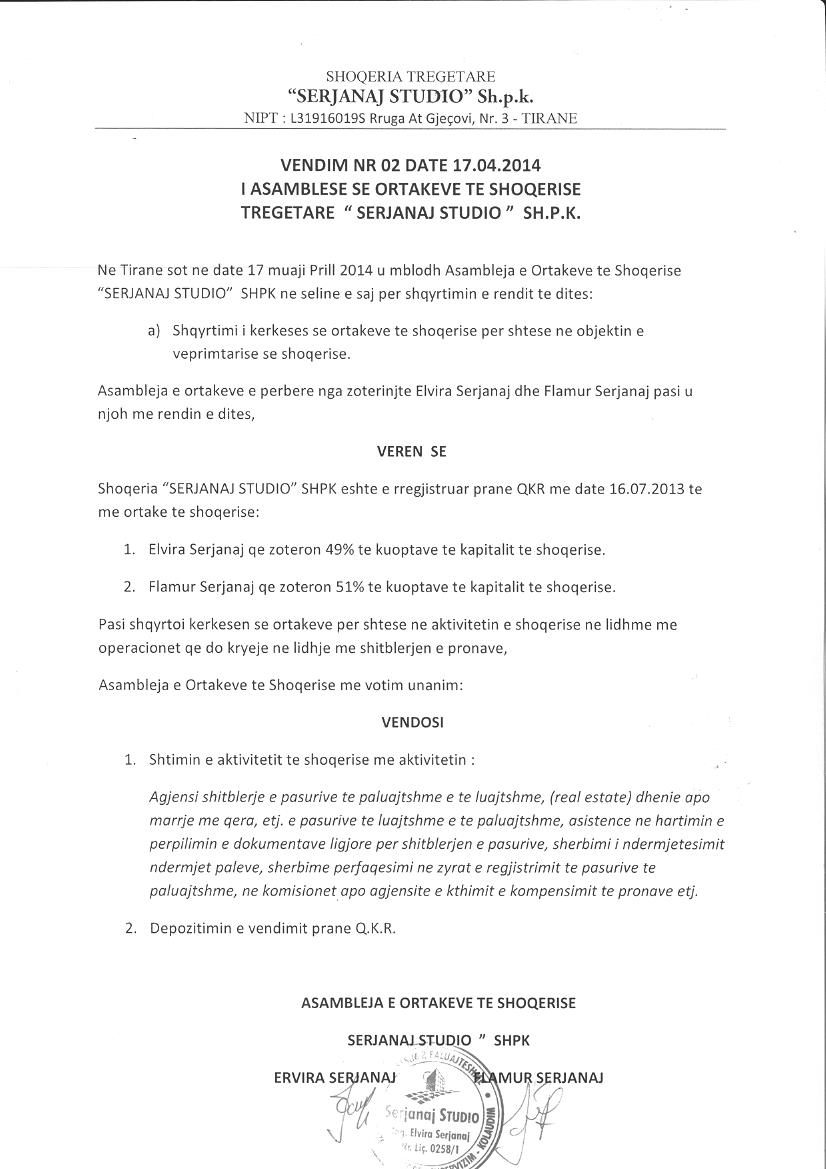 → Ekstrakt Historik i Regjistrit Tregtar, date 13.12.2021 → Statuti, Akt themelimi i shoqerise, date 15.07.2013 → Vendimi i Asamblese se Ortakeve, date 28.01.2014 → Vendimi i Asamblese se Ortakeve, date 17.04.2014 → Vendimi i Asamblese se Ortakeve, date 14.04.2017 |