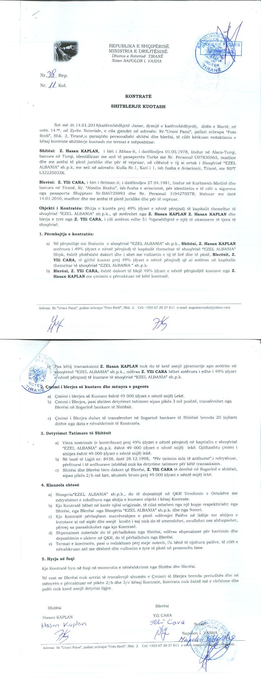 → Ekstrakt Historik i Regjistrit Tregtar date 10.10.2024 → Akt themelimi i Shoqerise → Kontratë Shitblerje Kuotash datë 14.01.2014 |