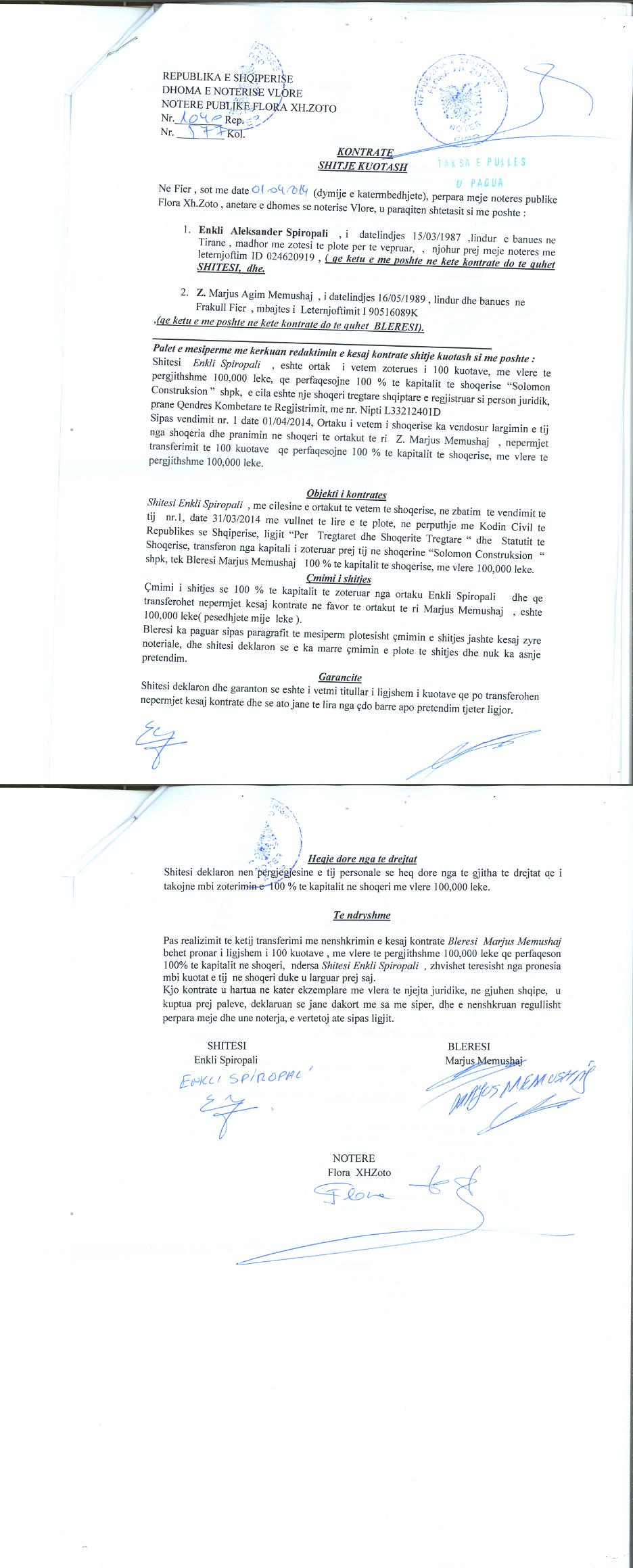 | Çështje Ligjore: | Me datë 29.06.2023, u lidh Marreveshja Siguruese, Nr. 3859 Rep., Nr.2531 Kol.., midis Fortes Construction shpk (Barredhenes) dhe Banka Credins SHA (Barremarres/Kredidhenes) me objekt vendosje barre mbi 100% te kuotave dhe te drejtave ne lidhje me to qe zoteron shoqeria Fortes Construction ne shoqerine " SOLOMON GROUP " SHPK me NUIS NIPT- L33212401D si dhe mbi kuotat e reja qe mund te zoteroje ne te ardhmen ne kete shoqeri tregtare. |