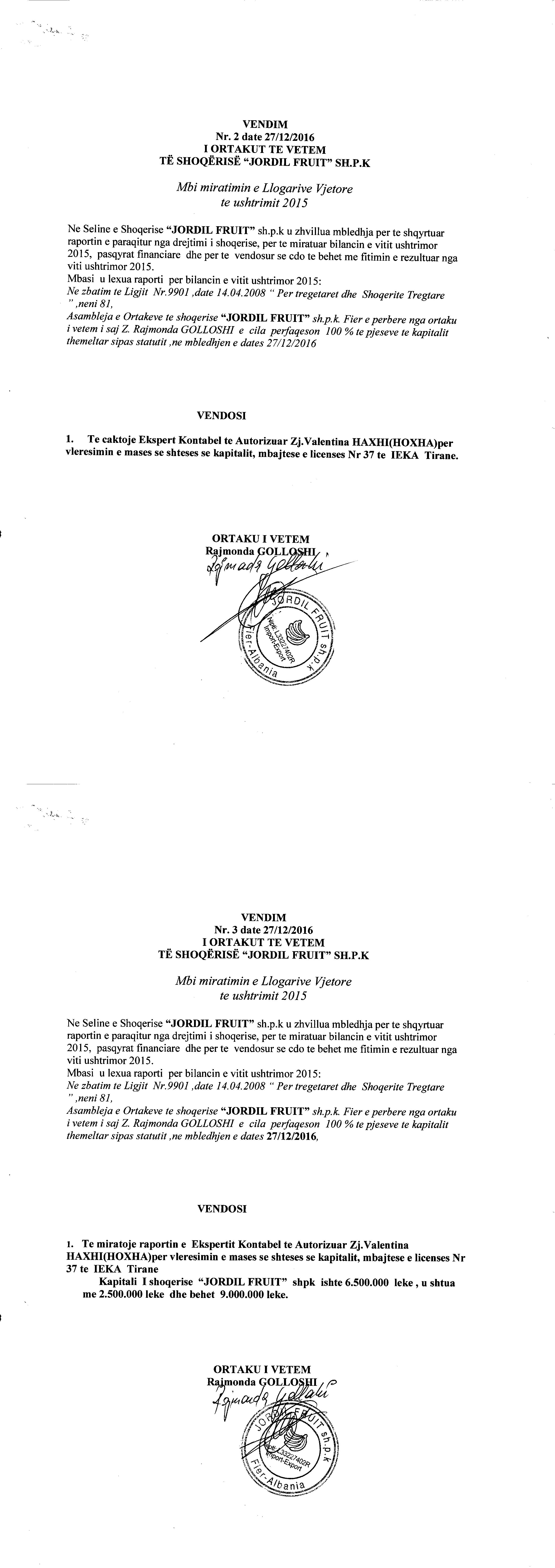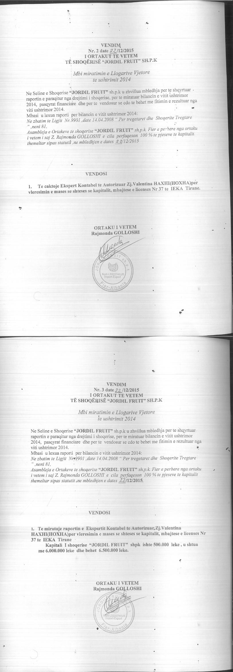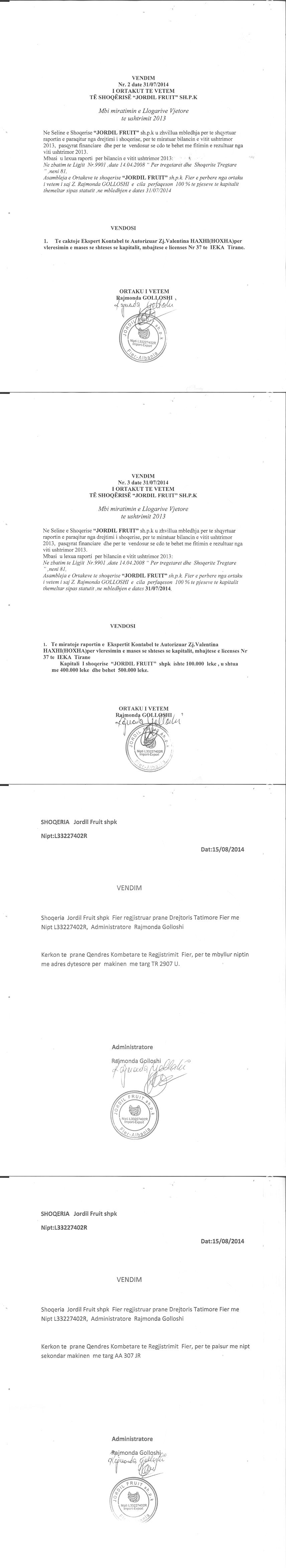 → Ekstrakti Historik i Regjistrit Tregtar date 07.06.2023 → Akt themelimi i Shoqerise → Vendim i Ortakut te Vetem, Zmadhim Kapitali date 31.07.2014 → Vendim i Ortakut te Vetem, Zmadhim Kapitali date 22.12.2015 → Vendim i Ortakut te Vetem, Zmadhim Kapitali date 27.12.2016 → Vendim i Ortakut te Vetem, Zmadhim Kapitali date 20.11.2017 → Vendim i Ortakut te Vetem, Zmadhim Kapitali date 05.07.2018 → Vendim i Ortakut te Vetem, Zmadhim Kapitali date 22.03.2022 |