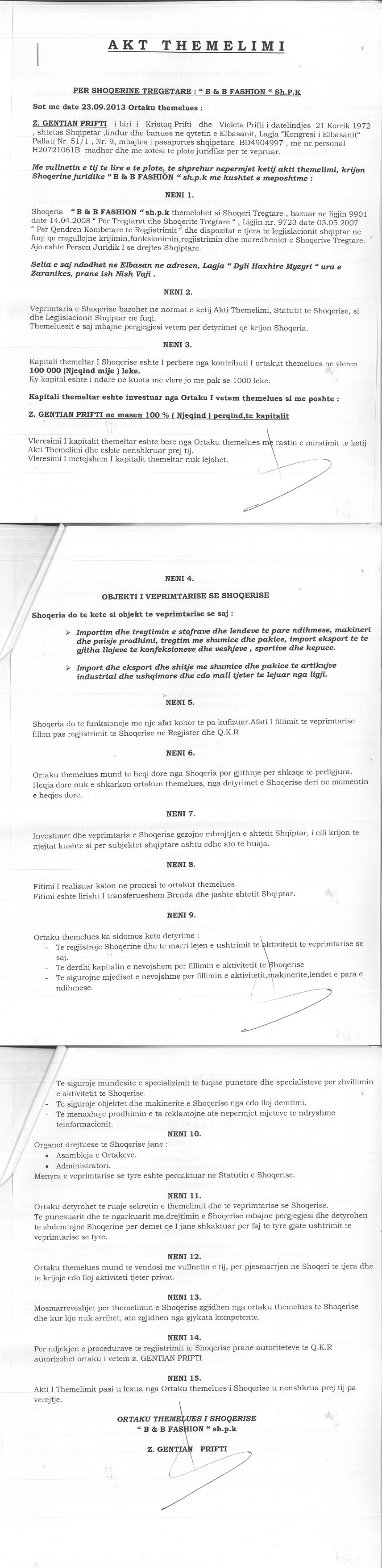 | Objekti i Veprimtarisë: | Importim dhe tregtimin e stofrave dhe lendeve te pare ndihmese, makineri dhe pajisje prodhimi, tregtim me shumice dhe pakice, import eksport te te gjitha llojeve te konfeksioneve dhe veshjeve, sportive dhe kepuce.Import dhe eksport dhe shitje me shumice dhe pakice te artikujve industrial dhe ushqimore dhe cdo mall tjeter te lejuar nga ligji |