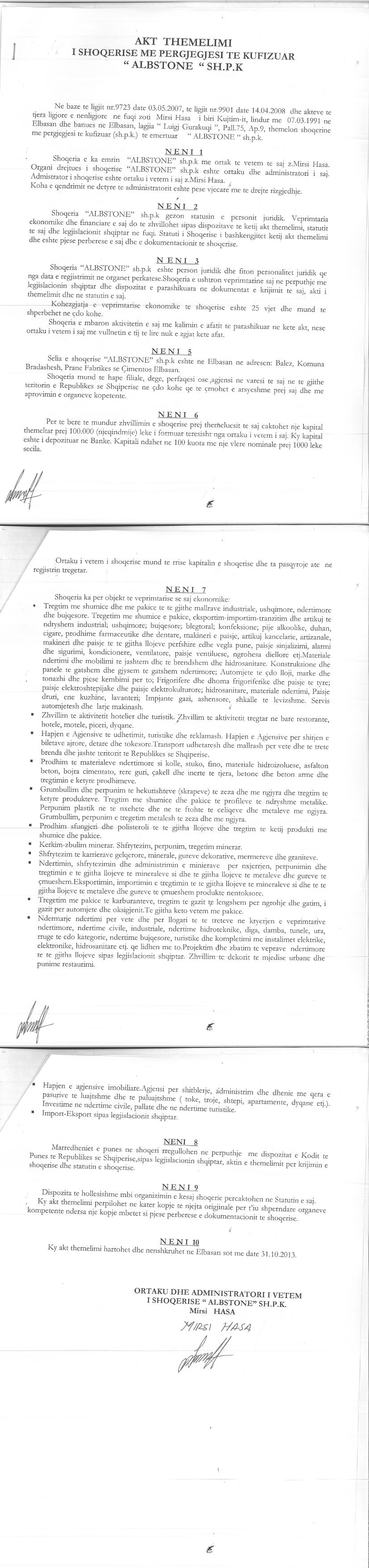 → Ekstrakt Historik i Regjistrit Tregtar, date 13.01.2022 → Ekstrakt Historik i Regjistrit Tregtar, date 13.01.2022 → Akt themelimi i shoqerise → Statuti i shoqerise → Vendim i ortakut te vetem, date 11.02.2016 → Vendim i ortakut te vetem, date 16.06.2016 → Urdher-Sekuestro, date 06.02.2018 → Urdher-sekuestro, date 09.02.2018 → Vendimi i ortakut te vetem, date 31.10.2019 |