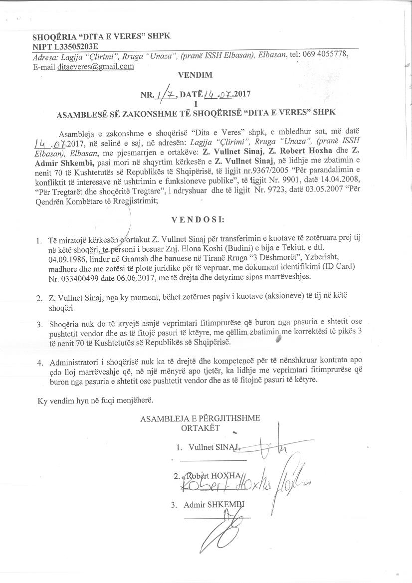 → Ekstrakt Historik i Regjistrit Tregtar date 09.08.2024 → Akt themelimi i Shoqerise → Vendim Nr. 1/7 i Asamblesë së Zakonshme, Miratimi i transferimit të kuotave të Vullnet Sinaj në favor të Personit të Besuar datë 14.07.2017 → Akt-Marrëveshje Nr. 1594 Rep. Nr. 219/1 Kol., për Caktimin e Personit të Besuar datë 20.07.2017 → Akt-Marrëveshje Nr.794 Rep., Nr.85/1 Kol., për Caktimin e Personit të Besuar datë 29.03.2018 → Akt-Marrëveshje Nr.3504 Rep., Nr.293/1 Kol., për Caktimin e Personit të Besuar datë 31.10.2018 |