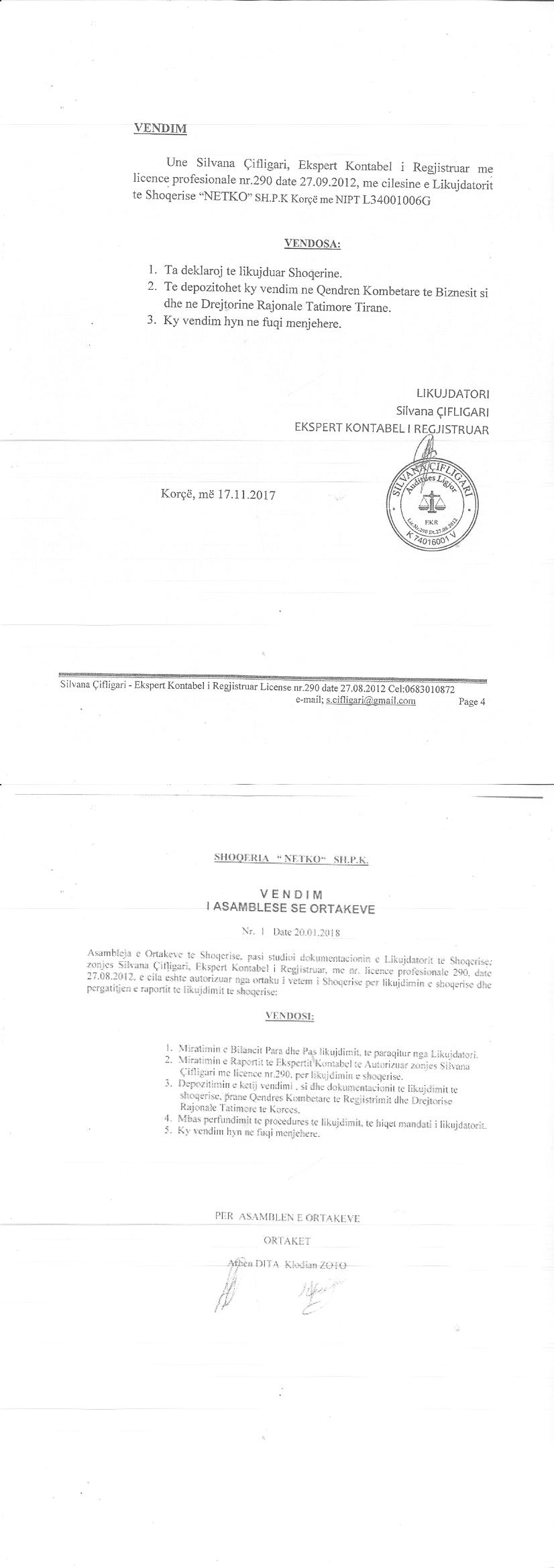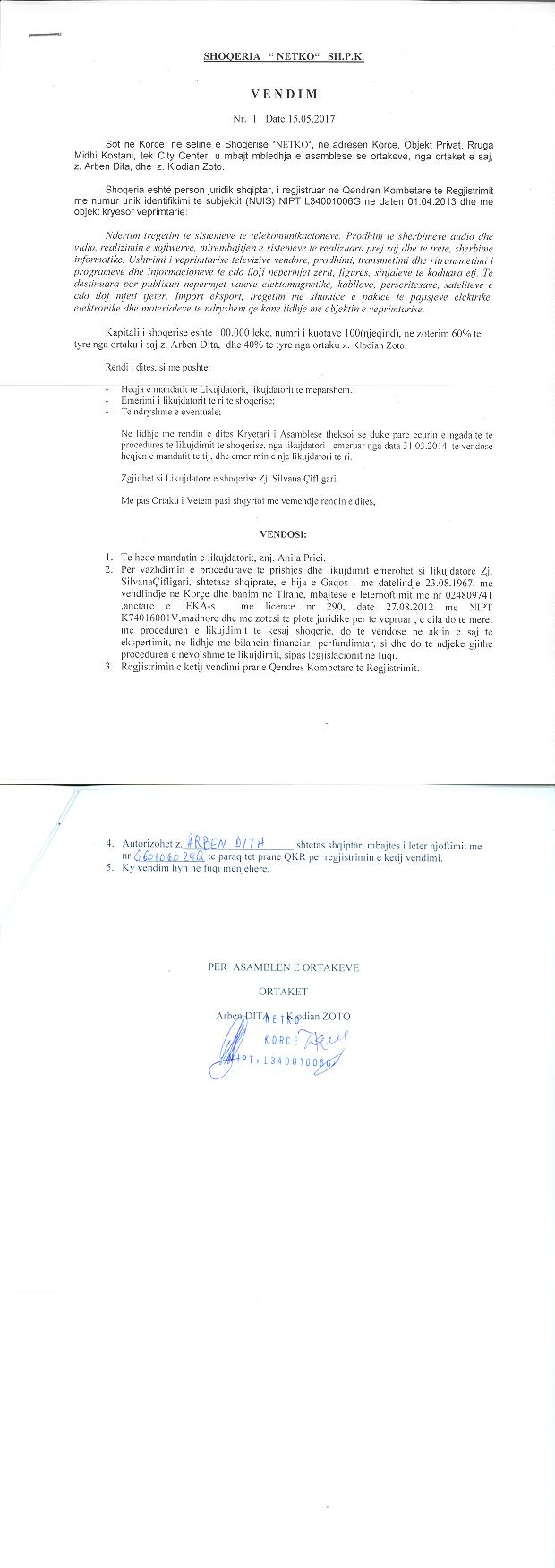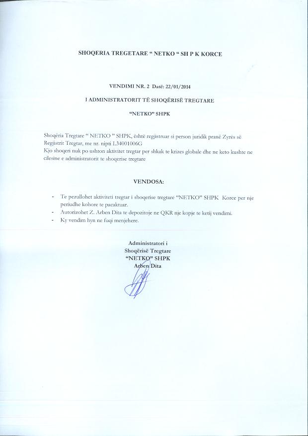 → Ekstrakt historik i regjistrit tregtar date 16.02.2022 → Statuti i shoqerise → Vendimi i administratorit per pezullimin e aktivitetit date 22.01.2014 → Vendimi i asamblese se ortakeve per ndryshimin e likuidatorit date 15.05.2017 → Vendimi per miratimin e likuidimit te shoqerise date 27.09.2012 |