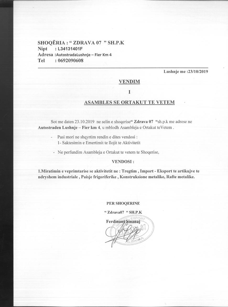 → Ekstrakt Historik i Regjistrit Tregtar, date 8/12/2021 → Akt themelimi, Statuti i shoqerise, date 30.05.2015 → Vendimi i Asamblese se Ortakve, date 23.10.2019 |