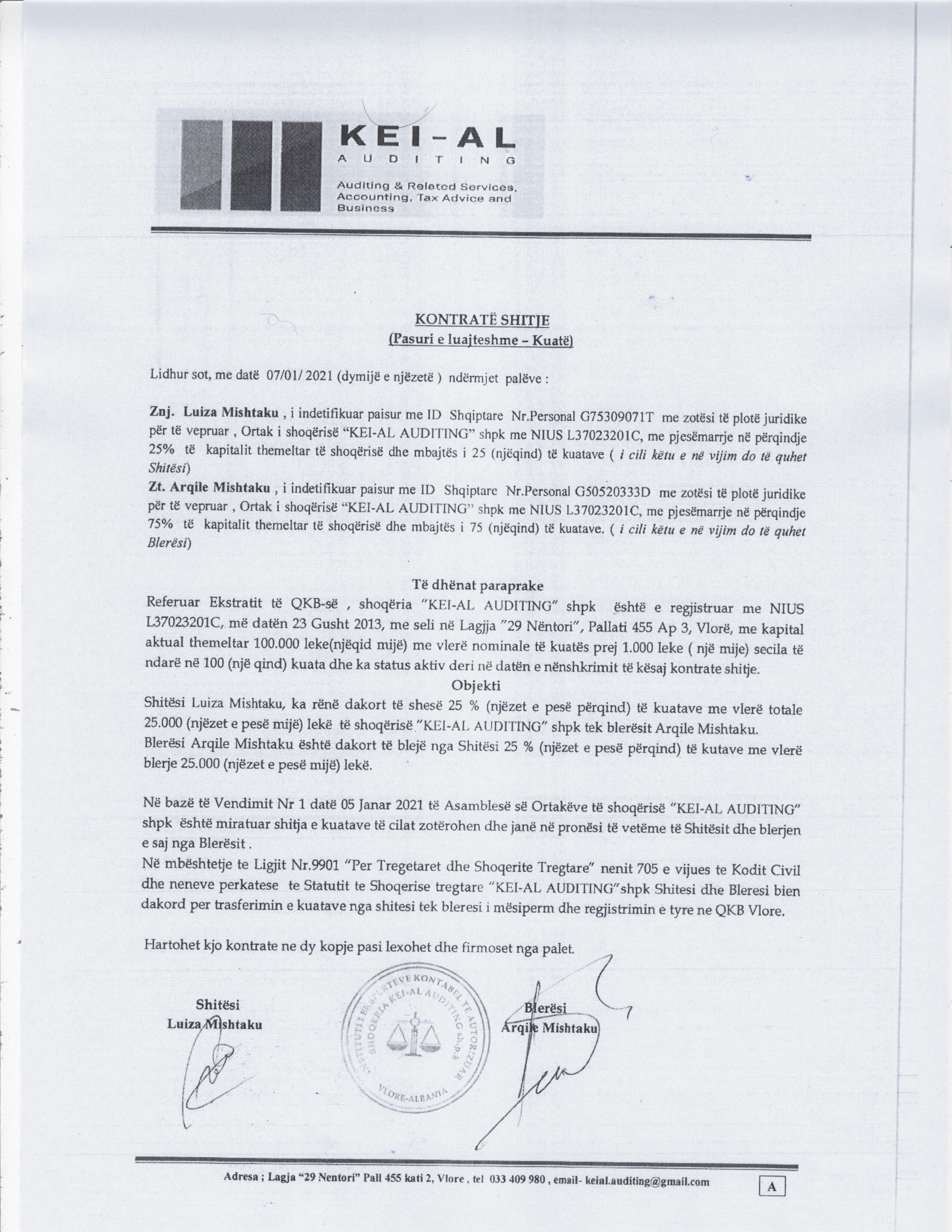→ Ekstrakt Historik i Regjistrit Tregtar date 04.10.2024 → Akt themelimi i Shoqerise → Kontrate shitje date 07.01.2021 → Ekstrakt Historik i Regjistrit Tregtar date 03.11.2025 |