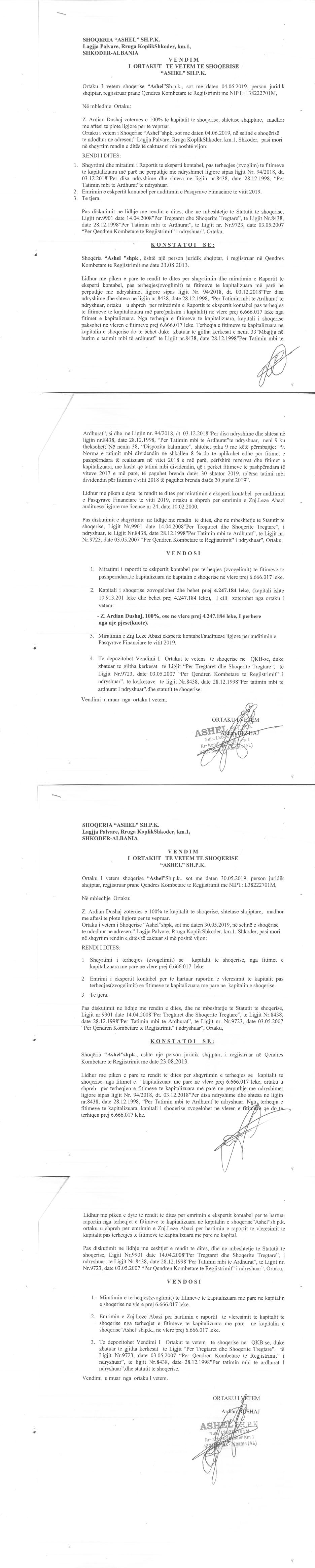 | Çështje Ligjore: | Bashkimi me Përthithje I. Me date 28.09.2020, me ane te Vendimit te Ortakut të Vetëm të Shoqërisë “ASHEL” shpk, u miratua nisja e proçedurave të bashkimit me përthithje të përthithjes së shoqerise “ ASHEL” shpk nga shoqeria “Ashel Group” shpk dhe u hartua Projekt Marrëveshja e Bashkimit. II. Me datë 25.11.2020, u nënshkrua Marrëveshja e Bashkimit me Përthithje ndërmjet shoqërive tregtare “ASHEL” shpk (shoqëria e përthithur) dhe “Ashel Group” shpk (shoqëria përthithëse). Pas bashkimit shoqëria “ASHEL” shpk do të transferojë të gjithë aktivin dhe pasivin tek shoqëria përthithëse dhe do pushoj së ekzistuari duke u çregjistruar kështu nga QKB. |