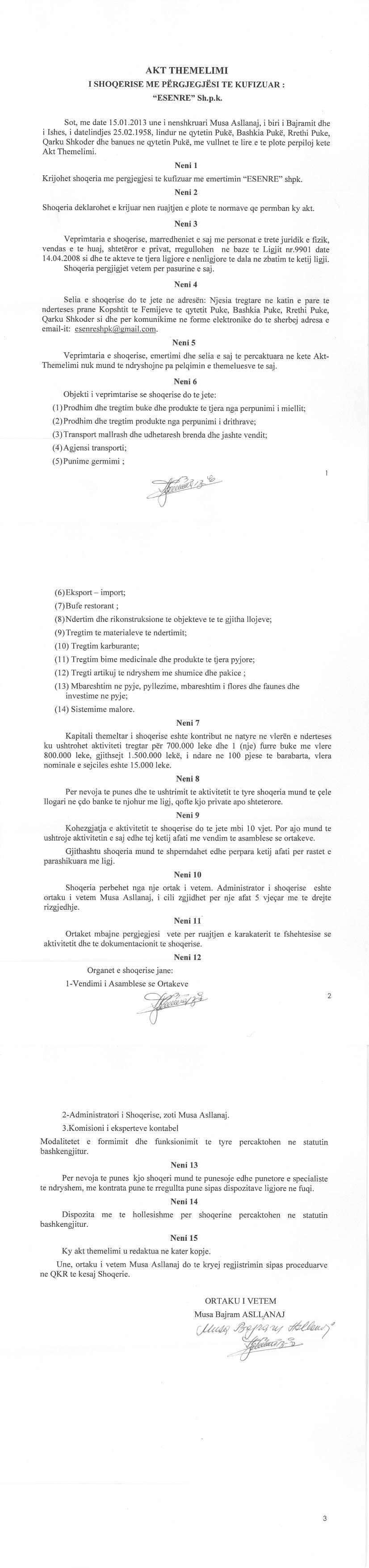| Emërtime të tjera Tregtare: | "ESENRE" SH.P.K |