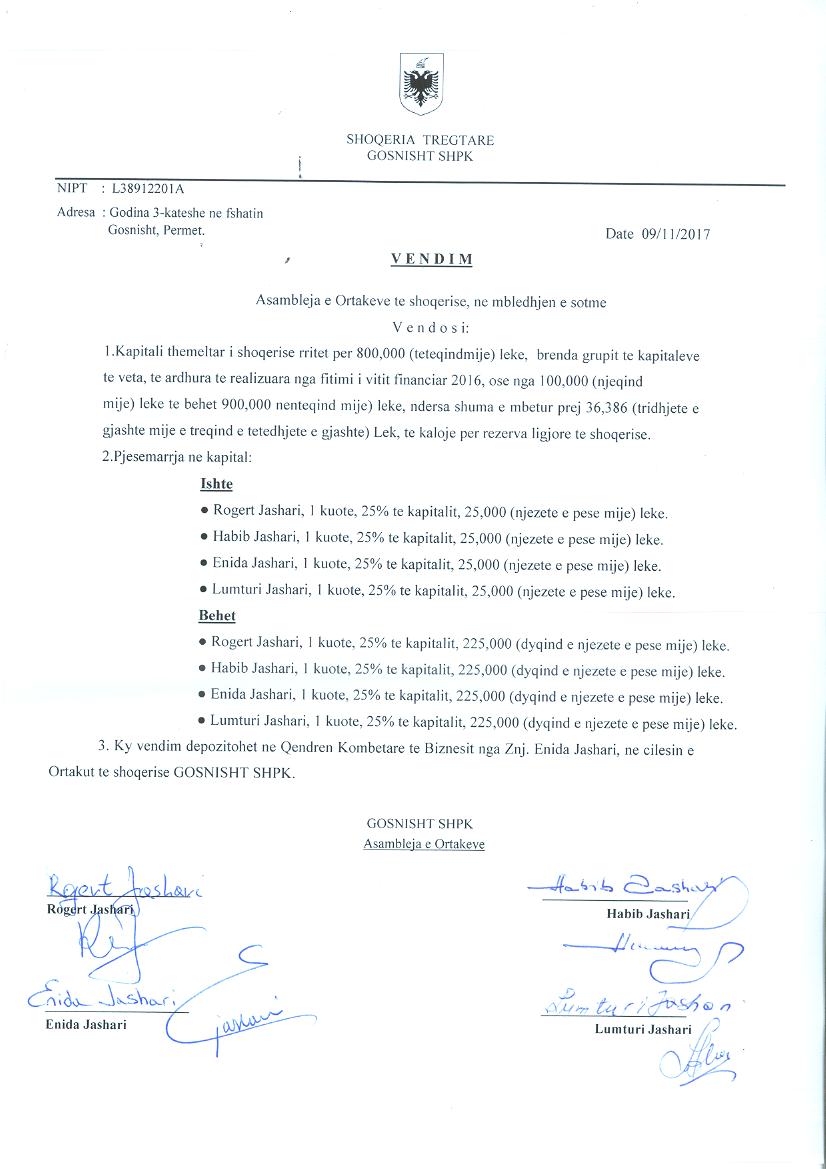 → Ekstrakt Historik i Regjistrit Tregtar date 10.10.2023 → Akt themelimi dhe Statuti i Shoqerise → Kontratë Dhurimi datë 09.01.2017 → Kontratë Dhurimi datë 31.03.2017 → Vendim i Asamblesë së Ortakëve, Zmadhim Kapitali datë 29.12.2016 → Vendim i Asamblesë së Ortakëve, Zmadhim Kapitali datë 09.11.2017 → Ekstrakt Historik i Regjistrit Tregtar date 17.04.2024 → Të dhënat e Investimit, Financimet Nga IPARD - Aksesuar nga Agjencia për Zhvillim Bujqësor dhe Rural AZHBR datë 17.04.2024 |