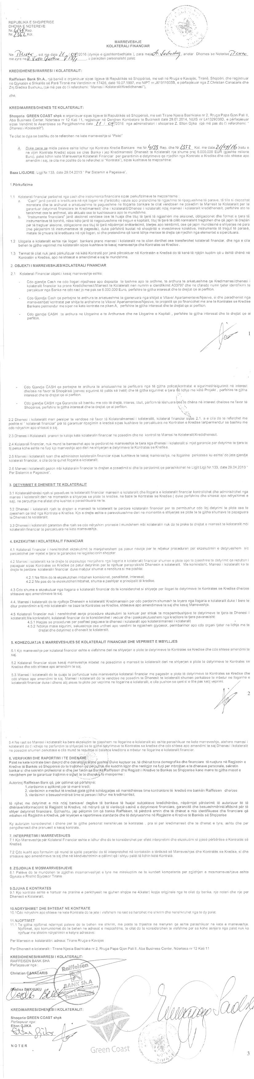 → Ekstrakt historik i regjistrit tregtar date 17.10.2023 → Statuti i shoqerise → EKSTRAKT HISTORIK I REGJISTRIT TË PRONARIT PËRFITUES date 17.10.2023 → Marreveshje siguruese date 18.06.2020 → Marreveshje siguruese date 28.08.2017 → Raporti i administratoreve dhe Projekt Marreveshja e Bashkimit me perthithje → Marreveshje kolaterali financiar date 21.09.2016 → Vendimi per zvogelimin e kapitalit date 23.11.2021 → Vendimi i asamblese per zvogelimin e kapitalit date 09.07.2021 → Vendimi i asamblese per zmadhimin e kapitalit date 19.12.2018 → Vendimi i asamblese per zmadhimin e kapitalit date 08.12.2017 → Vendimi i asamblese per rritjen e kapitalit date 19.12.2016 → Vendimi i asamblese se ortakeve per zmadhimin e kapitalit date 28.05.2015 → VENDIM NR.2/13, DATË 14/07/2016 PËR MIRATIMIN E STATUSIT “INVESTIM/INVESTITOR STRATEGJIK PROCEDURË E VEÇANTË” PËR PROJEKTIN E INVESTIMIT ME POTENCIAL STRATEGJIK “GREEN COAST” → VENDIM NR. 8 / 5, DATË 15 / 12 /2020 PËR MIRATIMIN E STATUSIT “INVESTIM/INVESTITOR STRATEGJIK PROCEDURË E VEÇANTË” PËR PROJEKTIN E INVESTIMIT “GREEN COAST” ME SUBJEKT APLIKUES "GREEN COAST" SH.P.K. → VENDIM NR. 12/1 DATË 04 / 02 / 2021 PËR MIRATIMIN E STATUSIT “INVESTIM/INVESTITOR STRATEGJIK PROCEDURË E VEÇANTË” PËR PROJEKTIN E INVESTIMIT “GREEN COAST 2” ME SUBJEKT APLIKUES "GREEN COAST" SH.P.K. → VENDIM Nr. 476, datë 13.7.2022 PËR MIRATIMIN E KALIMIT TË PASURIVE NR. 68/121/1, NR. 68/137/2 DHE NR. 5212/7/1, ME SIPËRFAQE, PËRKATËSISHT 5532 m2 , 2649 m2 DHE 593 m2 , TË NDODHURA NË ZONËN KADASTRALE 1739, NGA PRONË SHTETËRORE, NË PRONË PRIVATE, PËR SHOQËRINË “GREEN COAST” SHPK, DHE MIRATIMIN E PROJEKTKONTRATËS QË DO TË LIDHET PËR KËTË QËLLIM, NDËRMJET MINISTRISË SË FINANCAVE DHE EKONOMISË DHE SHOQËRISË “GREEN COAST” SHPK → Vendim i Asamblesë së Përgjithshme, Zvogëlim Kapitali datë 06.01.2023 → Vendim i Asamblesë së Përgjithshme, Zmadhim Kapitali datë 24.03.2023 → Vendimi i asamblese se ortakeve per zmadhimin e kapitalit date 23.08.2023 → Ekstrakt Historik i Regjistrit Tregtar date 30.09.2024 → Vendim i Asamblesë së përgjithshme, Zmadhim Kapitali datë 26.12.2023 → Vendim i Asamblesë së Përgjithshme, Zmadhim i Kapitali të Shoqërisë datë 27.12.2023 → Vendim i Asamblesë së Përgjithshme, Zmadhim i Kapitalit të Shoqërisë datë 23.02.2024 → Vendim i Asamblesë së Përgjithshme, Zmadhim i Kapitalit të Shoqërisë datë 26.02.2024 → Vendim i Asamblesë së Përgjithshme, Zvogëlim i Kapitalit të Shoqërisë datë 01.07.2024 → Vendim i Asamblesë së Përgjithshme, Zmadhim i Kapitalit të Shoqërisë datë 02.07.2024 → Deklartatës Noteriale Nr. rep. 4048 kol. 2269, datë 12.07.2024 → Marrëveshja Siguruese Nr. rep. 5885, kol. 3950, datë 01.08.2024 → Ekstrakt Historik i Regjistrit te Pronareve Perfitues date 30.09.2024 → Ekstrakt Historik i Regjistrit Tregtar date 18.07.2025 → Vendim i Asamblesë së Përgjithshme për Zvogëlimin e Kapitalit datë 11.09.2024 → Vendim i Asamblesë së Përgjithshme për Zmadhimin e Kapitalit datë 11.09.2024 → Vendim i Asamblesë së Përgjithshme për Zvogëlimin e Kapitalit datë 26.02.2025 → Vendim Nr. 30, datë 29.05.2024 i Këshillit Kombëtar të Territorit për Miratimin e Lejes së Zhvillimit për Objektin: “Resort Turistik ‘Green Coast 3’ me leje 1-4 kate mbi tokë dhe 1-2 kate nëntokë”, me Vendndodhje në Bashkinë Himarë. → Vendim Nr. 32, datë 31.07.2024 i Këshillit Kombëtar të Territorit për Miratimin e Lejes së Zhvillimit për Objektin: “Green Coast Resort 2, Zona G16, Objekte Banimi 1, 2, 3, 4 dhe 5 Kate mbi Tokë me 1 dhe 2 Kate nëntokë, Pishina dhe Mur Rrethues”, me Vendndodhje Palasë, Bashkia Himarë. → Vendim Nr. 33, datë 31.07.2024 i Këshillit Kombëtar të Territorit për Miratimin e Lejes së Zhvillimit për Objektin: “Rezidencë Banimi me 1 deri në 9 Kate mbi Tokë dhe 1 deri 4 Kate nëntokë, Zona G17, Green Coast Resort 2”, me Vendndodhje Palasë, Bashkia Himarë. → Vendim Nr. 34, datë 31.07.2024 i Këshillit Kombëtar të Territorit për Miratimin e Lejes së Zhvillimit për Objektin: “Green Coast Resort 2, Zona-JA, Objekt Banimi dhe Shërbime 1, 2, 3, 4 dhe 5 kate mbi tokë me 1 kat nëntokë dhe Vila Individuale me 2 kate mbi tokë me mur rrethues dhe hapësira rekreative me pishinë”, me Vendndodhje Palasë, Bashkia Himarë. → Vendim Nr. 37, datë 31.07.2024 i Këshillit Kombëtar të Territorit për Miratimin e Lejes së Zhvillimit për Objektin: “Green Coast Resort 2, Zona F, Kompleks Rezidencial me Apartamente 1, 2, 3, 4, 5, 6, 7, 8 Kate, me mur rrethues dhe pishina”, me Vendndodhje Palasë, Bashkia Himarë. |