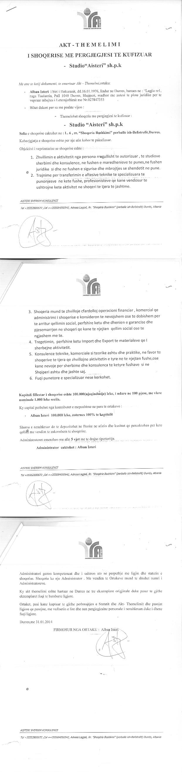 Objekti i Veprimtarisë: Zhvillimin e aktivitetit nga persona rregullisht të autorizuar, të studiove të shërbimit dhe konsulencës, në fushën e marrëdhënieve të punës, juridike si dhe në fushën e sigurisë dhe mbrojtjes së shëndetit në punë. Akt ekspertize mbi aksidentet në punë. Shërbime për sigurinë dhe shëndetin në punë. Kurse dhe trajnime për sigurinë dhe shëndetin në punë. Inspektim, mbikqyrje, supervizim për punën e kryer nga subjektet për sigurinë dhe shëndetin në punë. Përgatitje dhe hartim të dokumentave të vlerësimit të rrezikut në të gjitha fushat. Konsulencë dhe shërbime në fushën e shëndetit në punë në kompanitë private dhe shtetërore nëpërmjet profesionit të mjekut të punës apo mjekut të ndërrmarrjes. Organizimi i mbrojtjes kolektive dhe individuale, sigurimi i organizimit të vendit të punës e të mjeteve të nevojshëm, informimi, këshillimi dhe trajnimi profesional i punëmarrësve e përfaqësuesve të tyre, dhënia e këshillimit etj. Ofron Shërbimet e Jashtme të Specializuara për Parandalimin dhe Mbrojtjen në Punë, a) siguria në Punë; b)mjekësia e punës; c)ergonomia; d) higjena industriale, e) aspektet psikosociale të punës, pëfshirë edhe dhunën dhe ngacmimin seksual në punë f) mbrojtjen e të dhënave personale dhe privatësisë. Studimi, hartimi dhe përgatitja e Projekteve mbi masat e Mbrojtjes nga Zjarri të Ndërtesave të çdo lloji. Hartimi i Akteve të Ekspertizës Teknike për Zjarret e Rëna. Dhënia e Asistencës Teknike dhe Trajnimi i punonjësve për masat e PMNZSH (përjashtuar punonjësit e PMNZSH-së). Inspektim, mbikqyrje, supervizim për punën e kryer nga subjektet për mbrojtjen nga zjarri. Tregtim të mjeteve mbrojtëse individuale në punë. Tregtim të mjeteve të shuarjes së zjarrit dhe aksesorëve të ndryshëm. Eksport - import të mjeteve të mbrojtjes në punë dhe mjeteve të shuarjes së zjarrit. Projektime dhe zbatime të ndërtimeve të konstruksioneve metalike, shkallë emergjence e të tjera. Zhvillimi i Planeve të Sigurisë dhe Koordinimit, Planeve të Ndihmës së Parë dhe evakuimit. Plani i Sigurisë Operacionale. Asistencë dhe Konsulencë për Aktivitetet e Koordinimit për Projektimin dhe Kryerjen e Punës së Sigurisë për Vendet e Ndërtimit Publik dhe Privat. Çertifikim mbi Menaxhimin e rrezikut dhe zbatimin e sistemeve të menaxhimit të kompanive sipas standarteve ISO9001, ISO14001, SA8000, OHSAS 18001 etj. Ekspertizë, analizë e rreziqeve dhe pikat kritike të kontrollit (HACCP). Kurse të formimit profesional për sigurinë dhe shëndetin në punë (Dëshmi dhe Çertifikata) sipas tipologjive: Mbrojtje nga zjarri emergjencat dhe evakuimin, Ndihma e parë mjekësore, Formim i punëmarrësve për sigurinë dhe shëndetin në punë, Këshilli i sigurisë dhe shëndetit në punë, Person përgjegjës dhe specialist për sigurinë në punë, Drejtues të sigurisë aziendale, siguria në punë në ndërtim. Formim për sigurinë në punë në sektorin mekanik bujqësor. Formim i instruktorëve të formimit profesional për sigurinë në punë, Formim mbi sigurinë në punë për pajisje dhe makineri industriale, mekanike bujqësore (motopirun, platforma lëvizëse, vinça teleskopik, vinça ure, skela, pompa betoni, suvatimi, makineri bujqësore, etj) që nuk klasifikohen si mjete të qarkullimit rrugor, transport mallrash të rrezikshëm (ADR). Formim mbi sigurinë në punë në sektorin hekurudhor, miniera, tunele, karriera, ujësjellëskanalizime, elektrik, Oshee, portual, aeroportual, hidro energjetik, ndërtim etj. Formim mbi administrimin e ndërtesave të përbashkëta të banimit, Formim mbi menaxhimin e burimeve njerëzore, asistente zyre. Formim në fushat pikturë, grafik\design etj. Agjensi profesionale e rekrutimi për punësim, e cila ofron shërbime profesionale të burimeve njerëzore, trajnim, këshillim karriere etj. Kurse të Formim Profesional për : Mbrojtjen dhe menaxhimin e dëmeve në mjedis, për "Person Përgjegjës H.S.E (Shëndetin, Sigurinë dhe Mjedisin)", për "Manovrues/Drejtues Vinci Kulle", për "Person përgjegjës për rrezikun elektrik".