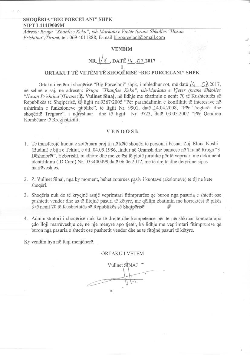 → Ekstrakt Historik i Regjistrit Tregtar date 09.08.2024 → Akt themelimi i Shoqerise → Vendim Nr. 1/7 i Asamblesë së Zakonshme, Miratimi i transferimit të kuotave të Vullnet Sinaj në favor të Personit të Besuar datë 14.07.2017 → Akt-Marrëveshje Nr. 1594 Rep. Nr. 219/1 Kol., për Caktimin e Personit të Besuar datë 20.07.2017 → Akt-Marrëveshje Nr.794 Rep., Nr.85/1 Kol., për Caktimin e Personit të Besuar datë 29.03.2018 → Akt-Marrëveshje Nr.3504 Rep., Nr.293/1 Kol., për Caktimin e Personit të Besuar datë 31.10.2018 → Urdhër për Vënien e Sekuestros datë 12.02.2020 → Urdhër për Heqjen e Sekuestros datë 10.03.2020 → Kontratë Dhurimi Kuotash datë 11.03.2020 → Urdhër për Vënien e Sekuestros datë 19.07.2022 → Urdhër për Heqjen e Sekuestros datë 08.08.2022 → Vendim Nr. 3/1 i Asamblesë së Zakonshme, për moskryerjen e Veprimtarive Fitimprurëse që buron nga Pasuria e Shtetit ose Pushteti Vendor datë 25.05.2017 |