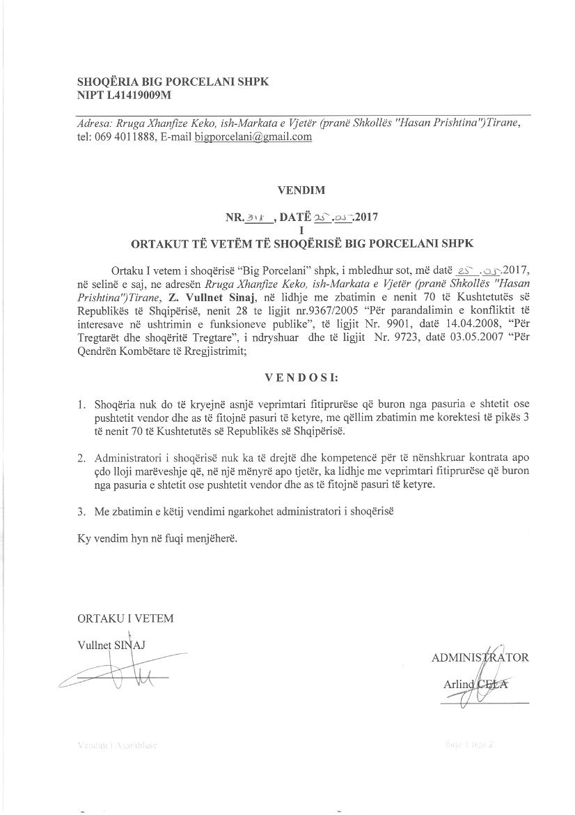 | Shënime: | Kompetencat e Administratorit: Administratori i Shoqërisë nuk ka të drejtë dhe kompetencë për të nënshkruar kontrata apo çdo lloj marrvëshje që në një mënyrë apo tjetër, ka lidhje me veprimtari fitimprurëse që buron nga pasuria e shtetit ose pushtetit vendor dhe as të fitojnë pasuri të këtyre. |