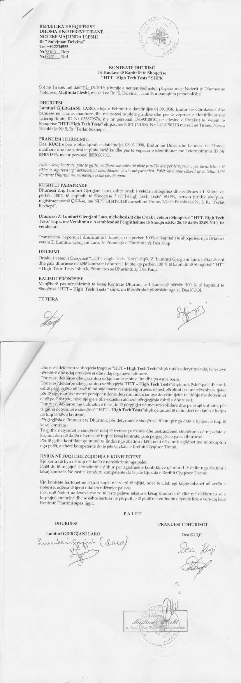 V. Me date 27.08.2020, me ane te kontrates se dhurimit te kuotave te kapitalit, Dea Kuqi dhuron 100% te kuotave ne favor te ortakut te ri Emirjon Allajbeu.