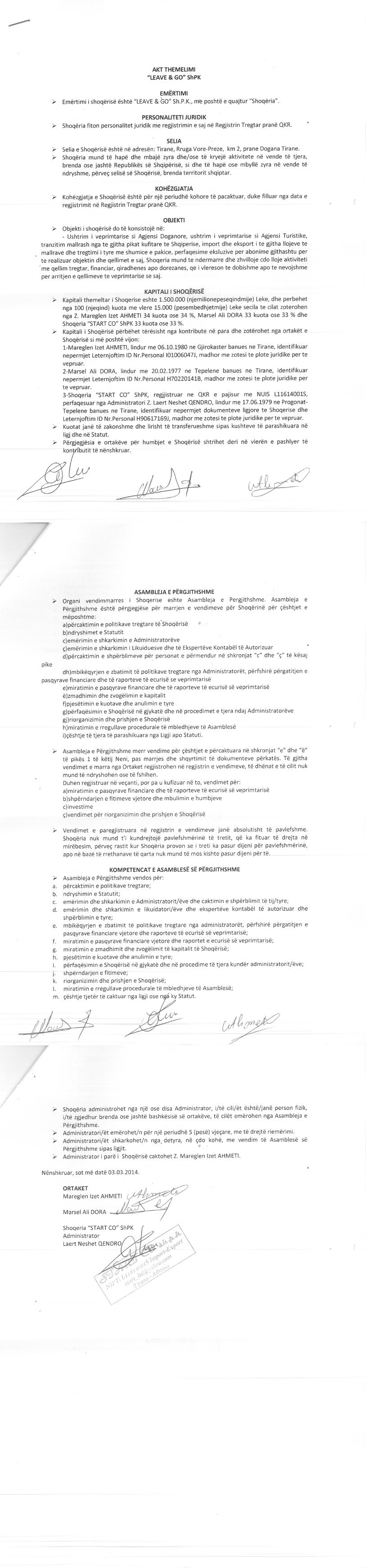 | Shoqëri Mëmë / Zotërues për këtë Subjekt: | "START CO", shoqëri me përgjegjësi të kufizuar, e themeluar më datë 11/04/2011, sipas ligjeve të Republikës së Shqipërisë, me numër identifikimi në regjistrin tregtar NIPT L11614001S, me adresë aktuale në Tirane Bulevardi Gjergj Fishta, Kulla G&P, Kati 1, dhe me administrator Ardenis Qëndro. Ortak të shoqërisë janë Anila Qendro 50% dhe Shupo Qëndro 50%. (Sipas të dhënave të QKB deri më datë 10.09.2024) Sipas Ekstraktit Historik te Regjistrit te Pronarit Perfitues, depozituar në QKB date 29.06.2021, terhequr datë 10.09.2024, Pronaret perfitues te subjektit “LEAVE & GO”, zoterues te 25% te kapitalit e me teper, janë: Anila Qendro, shtetas shqiptare, e datelindjes 1972, pronar perfitues per 16.5% te pronesise pasi zoteron 50% te kapitalit të “START CO” shpk – shoqëri mëmë për 33% te “LEAVE & GO”. Data e percaktimit si pronar perfitues është 03.03.2014. Shupo Qëndro, shtetas shqiptar, e datelindjes 1983, pronar perfitues per 16.5% te pronesise pasi zoteron 50% te kapitalit të “START CO” shpk – shoqëri mëmë për 33% te “LEAVE & GO”. Data e percaktimit si pronar perfitues është 03.03.2014. Mareglen Ahmeti, shtetas shqiptar, i datelindjes 1980, pronar perfitues per 34% te pronesise në formë direkte. Data e percaktimit si pronar perfitues është 03.03.2014. Marsel Dora, shtetas shqiptar, i datelindjes 1977, pronar perfitues per 33% te pronesise në formë direkte. Data e percaktimit si pronar perfitues është 03.03.2014. |