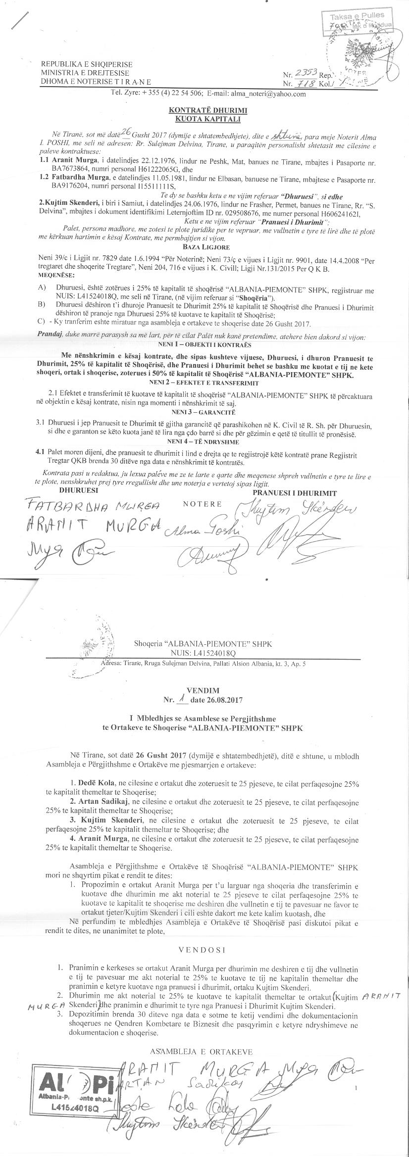 → Ekstrakt Historik i Regjistrit Tregtar date 04.10.2023 → Akt themelimi i Shoqerise → Kontratë Dhurimi Kuotash datë 26.08.2017 → Kontratë Dhurimi Kuotash datë 05.07.2018 → Kontratë Dhurimi Kuotash datë 03.10.2018 → Kontratë Shitje Kuotash datë 12.02.2019 → Ekstrakt Historik i Regjistrit Tregtar date 16.04.2024 → Të dhënat e Investimit, Financimet Nga IPARD - Aksesuar nga Agjencia për Zhvillim Bujqësor dhe Rural AZHBR datë 17.04.2024 |