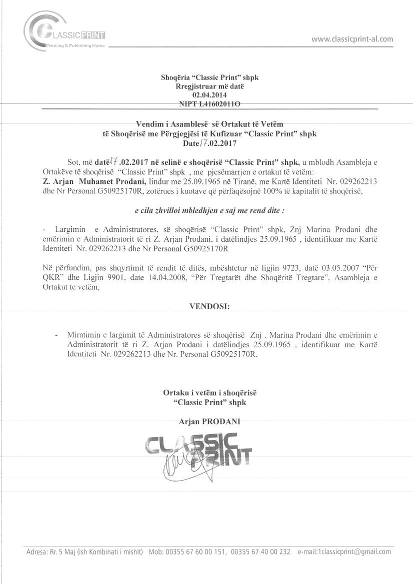 → Ekstrakt Historik i Regjistrit Tregtar, date 1.12.2021 → Kontrata e shitjes se kuotave, date 30.07.2015 → Vendimi i Asamblese se Ortakeve, date 17.08.2016 → Vendimi i Asamblese se Ortakut , date 17.02.2017 |