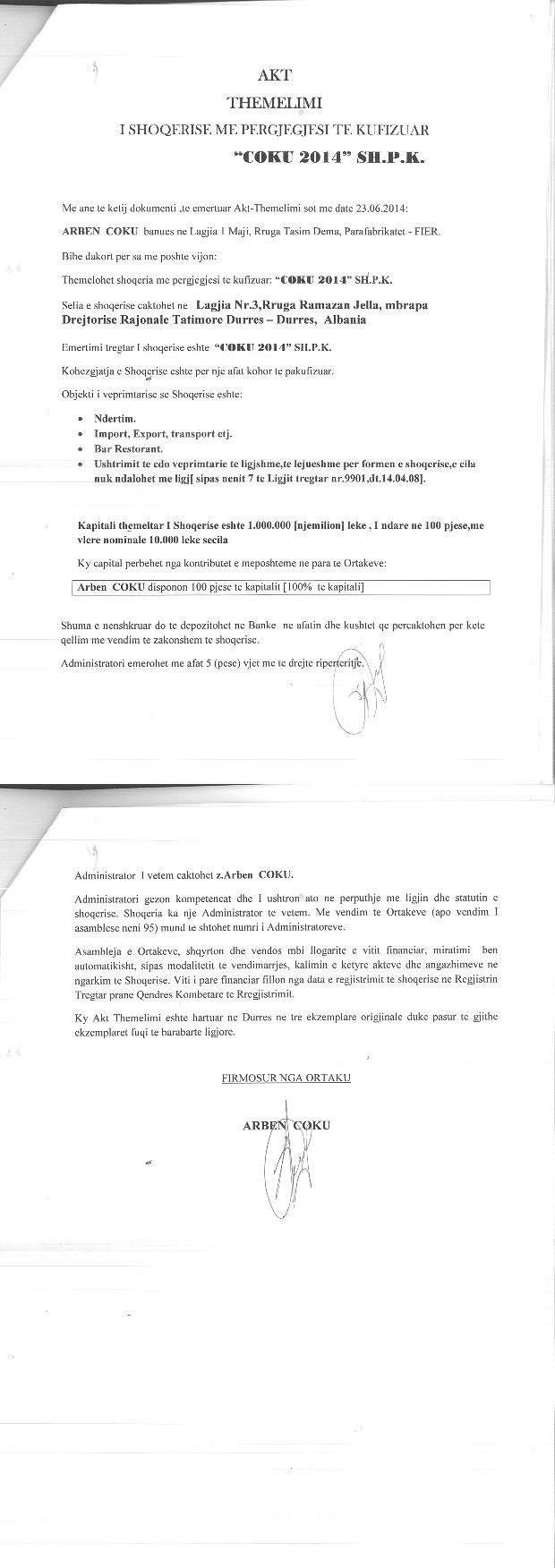| Objekti i Veprimtarisë: | Ndertim, import-eksport, transport etj. Bar-restorant. Ushtrimit te çdo veprimtarie te ligjshme, te lejueshme per formen e shoqerise, e cila nuk ndalohet me ligj. Dhenie e apartamenteve me qera |