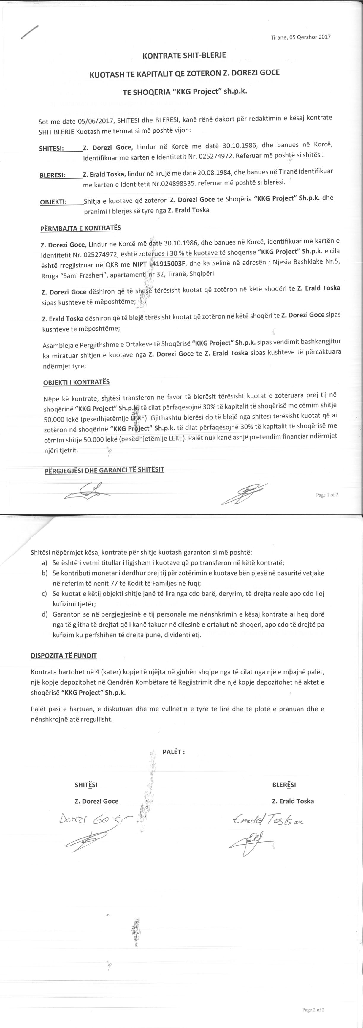 → Ekstrakt historik i regjistrit tregtar 20.10.2021 → Kontrate shitje kuotash 07.10.2016 → Kontrate shit-blerje e kuotave te kapitalit 05.06.2017 → Ekstrakti Historik i Regjistrit Tregtar date 08.05.2023 → Kontrate Dhurimi Kuotash date 26.04.2023 |